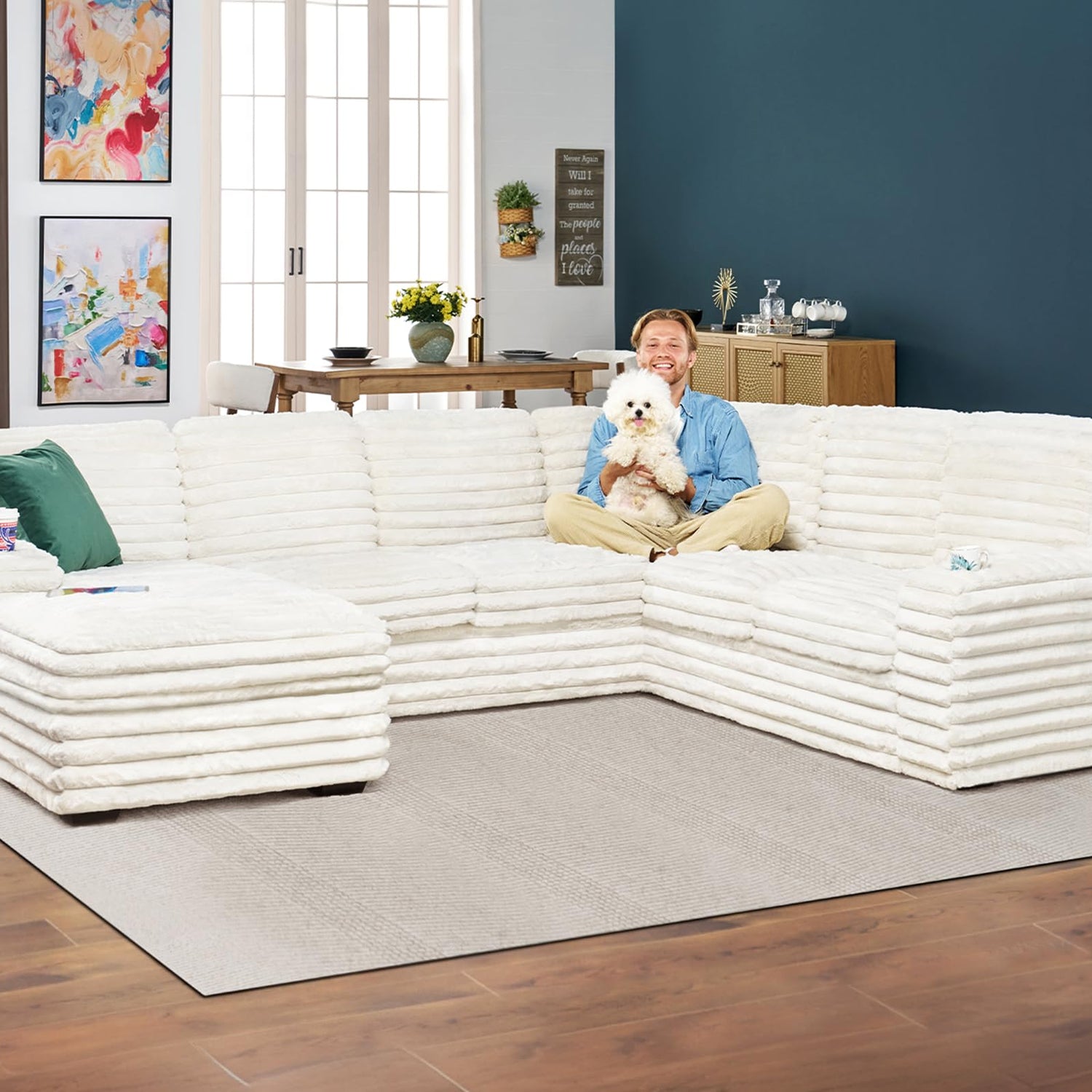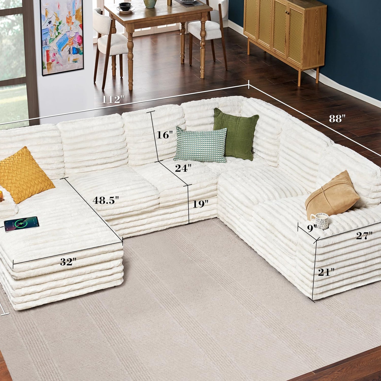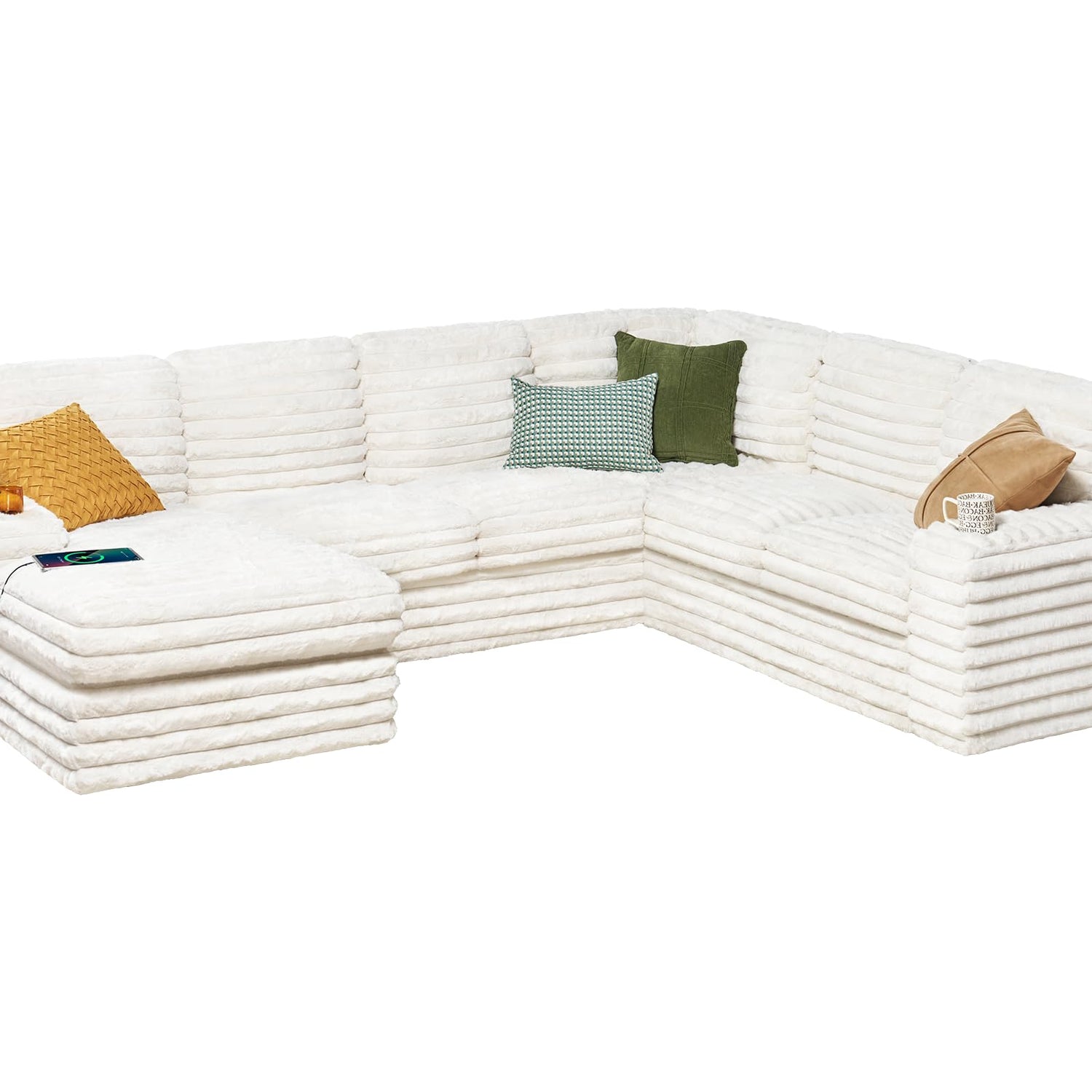 PaPaJet 112 Inch U Shaped Couch, Oversized Couch with Storage, Sectional Sofa with Chaise & 2 USB Ports, Faux Fur White Sofa