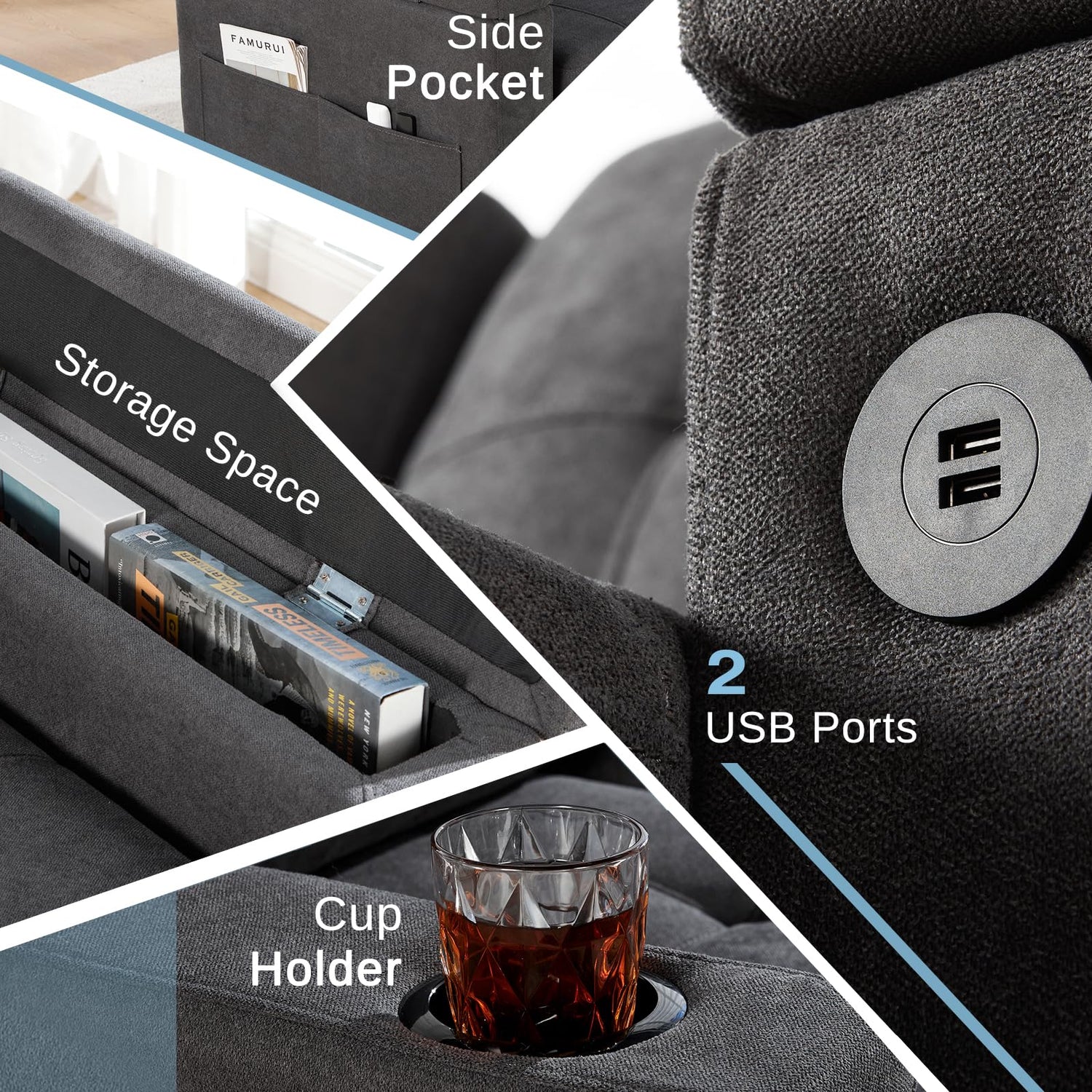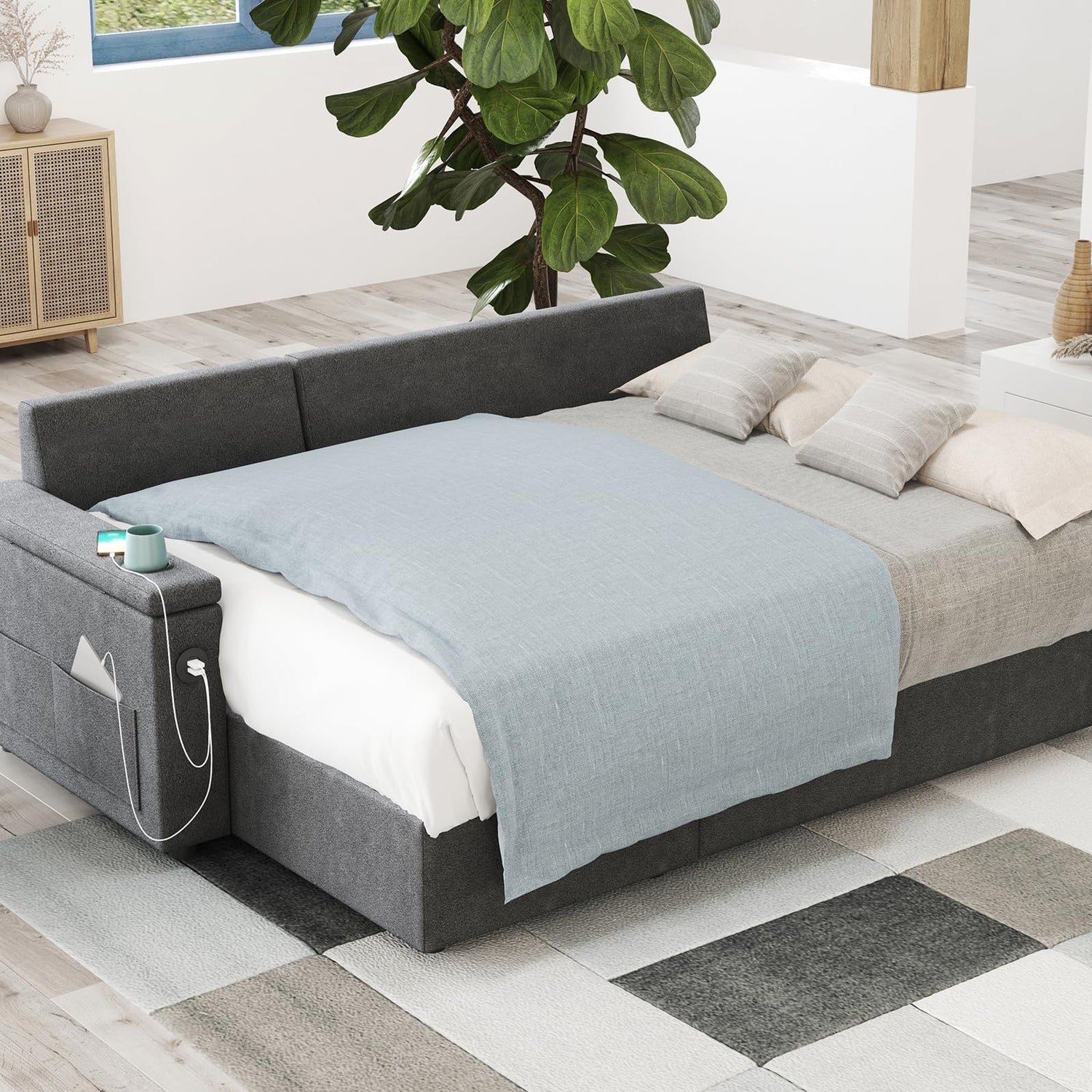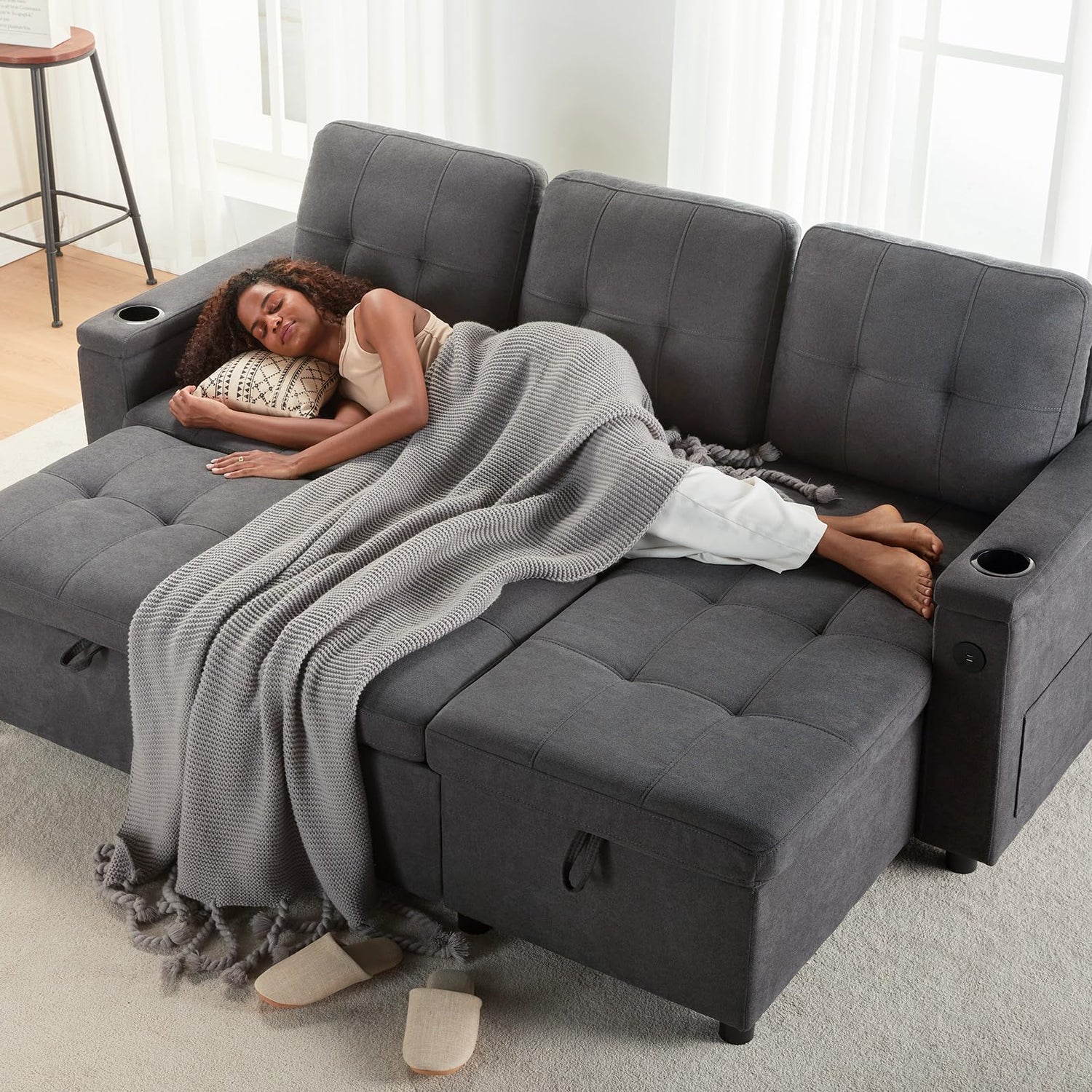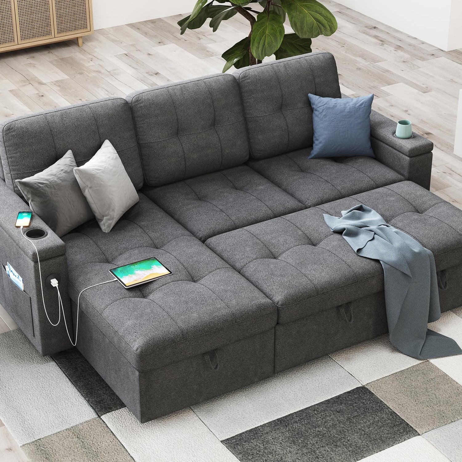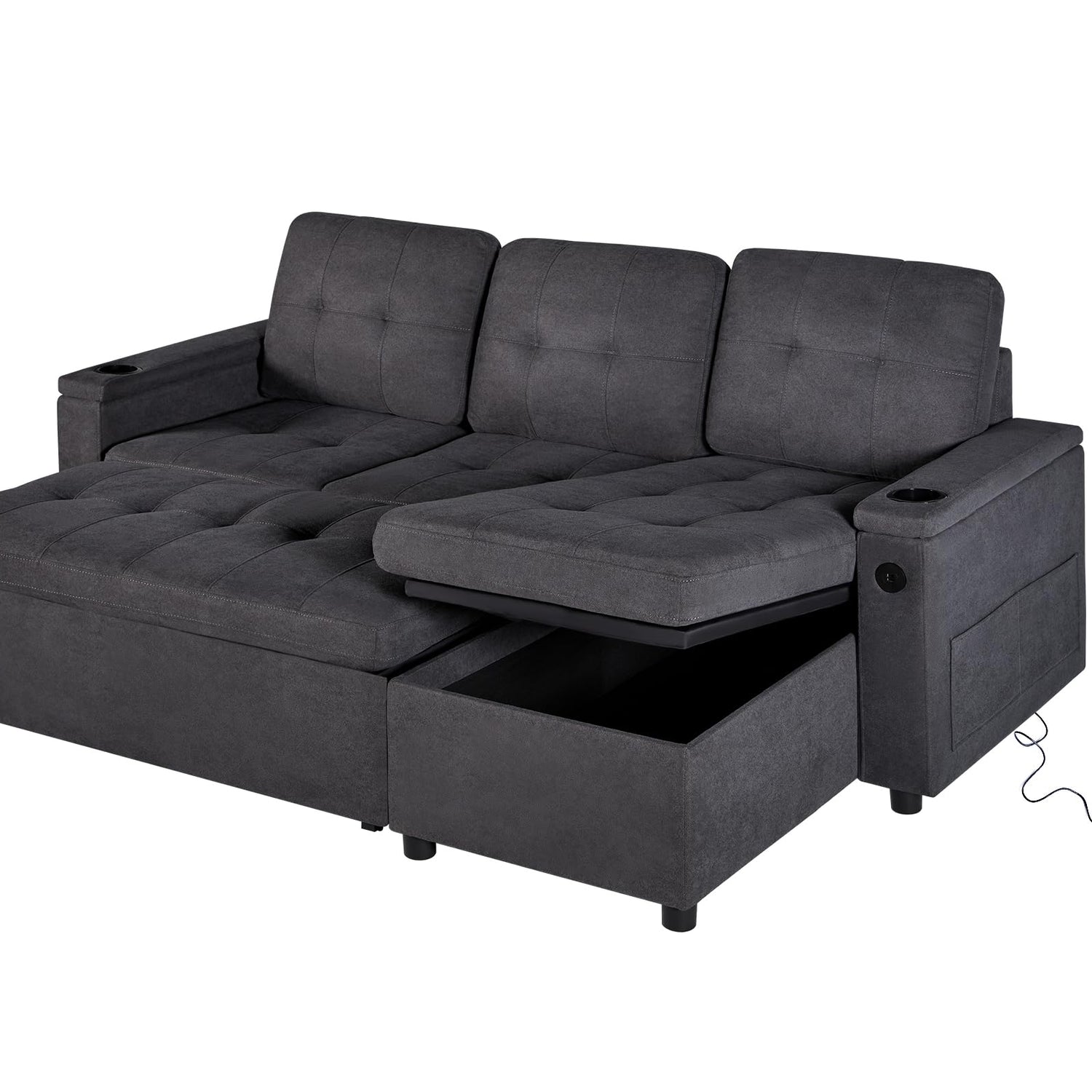 - Versatile Armrest: This convertible sofa comes with 2 integrated USB ports for convenient device charging. When you lift the armrest, you'll find hidden storage, additional side pockets, and holders for your drinks.