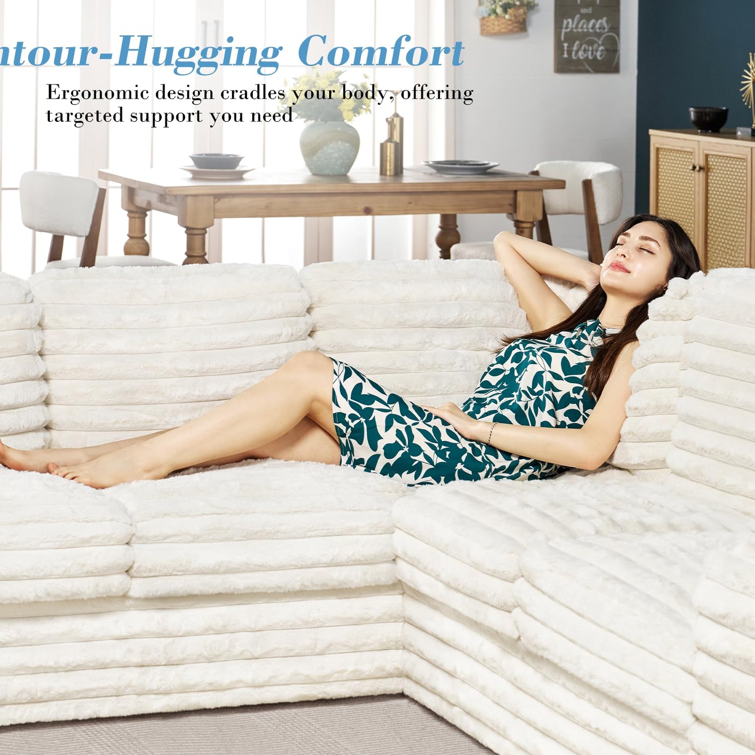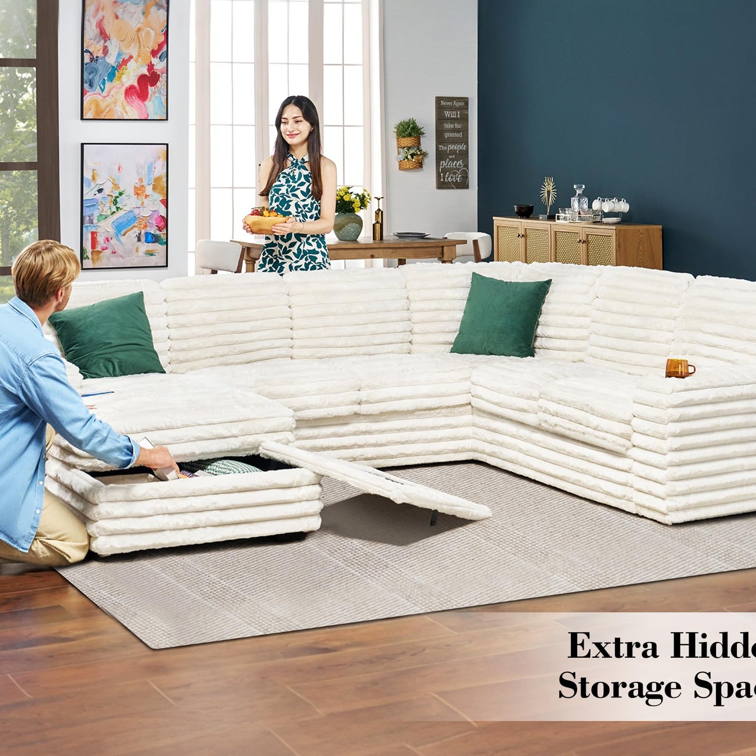 PaPaJet U Shaped Couch, 112 Inch Oversized Couch with Storage, Sectional Sofa with Cup Holders & 2 USB Ports, Faux Fur White Sofa Couch