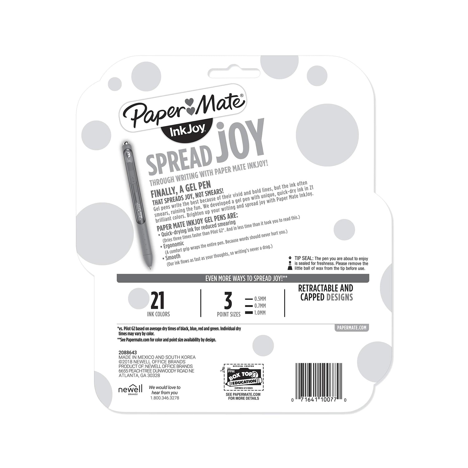 Details: Spread joy (not smears) with Paper Mate InkJoy Gel Pens. With vivid gel ink that dries 3X faster for reduced smearing, it’s like a party on the page where smudges aren’t invited. Brilliant color ensures your writing will be bright and filled with fun. Fully wrapped with a comfort grip, Paper Mate InkJoy pens have a smooth style that keeps the joy flowing as fast as your thoughts vs Pilot G2 based on average dry times of black, blue, red, and green. Individual dry times may vary by color.