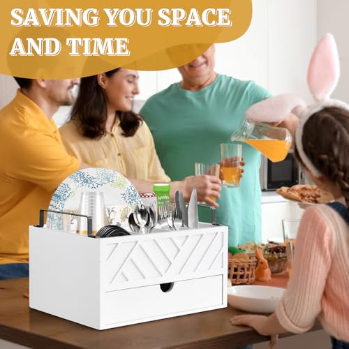 • 【Paper Plate Dispenser with Drawer & Handles】Featuring 5 compartments and a drawer, our kitchen paper plate holders will help you separate and organize disposable dishes, spoons, forks, knives, napkins, paper cups, straws, condiments. Carefully designed with 2 metal handles, this wood white utensil caddy is easy to carry and adds aesthetic appeal. The open top design makes your kitchen accessories within reach. Elevate your dining experience with our meticulously crafted silverwar caddy.