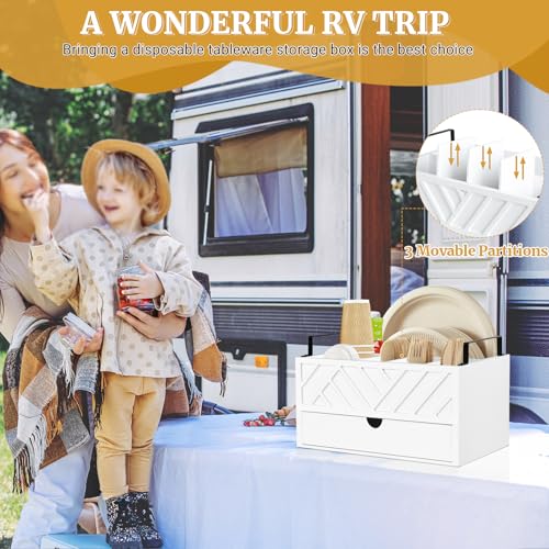 Details: Flatware Organizers White Paper Plate Dispenser with Drawer, Paper Plate Holder for Kitchen Counter, Wood Rustic Silverware Utensil Caddy (White)