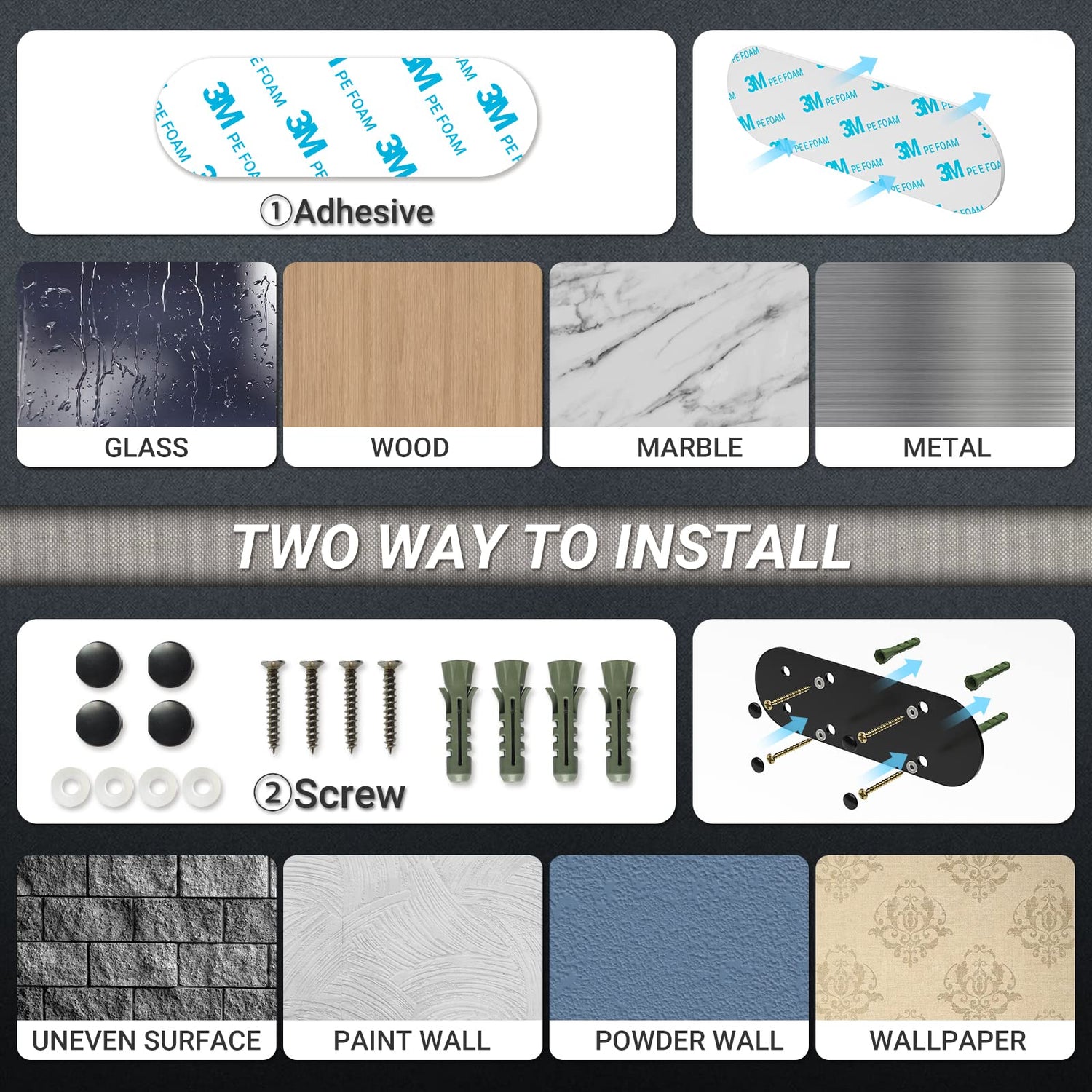 - TWO WAY TO INSTALL: Paper towel holder wall mount kitchen organization has two way to install, Adhesive or Screw. Each set come with adhesive, screw, mounting accessories and instructions. You could choose the farmhouse paper towel holder appropriate installation method according to your wall state.