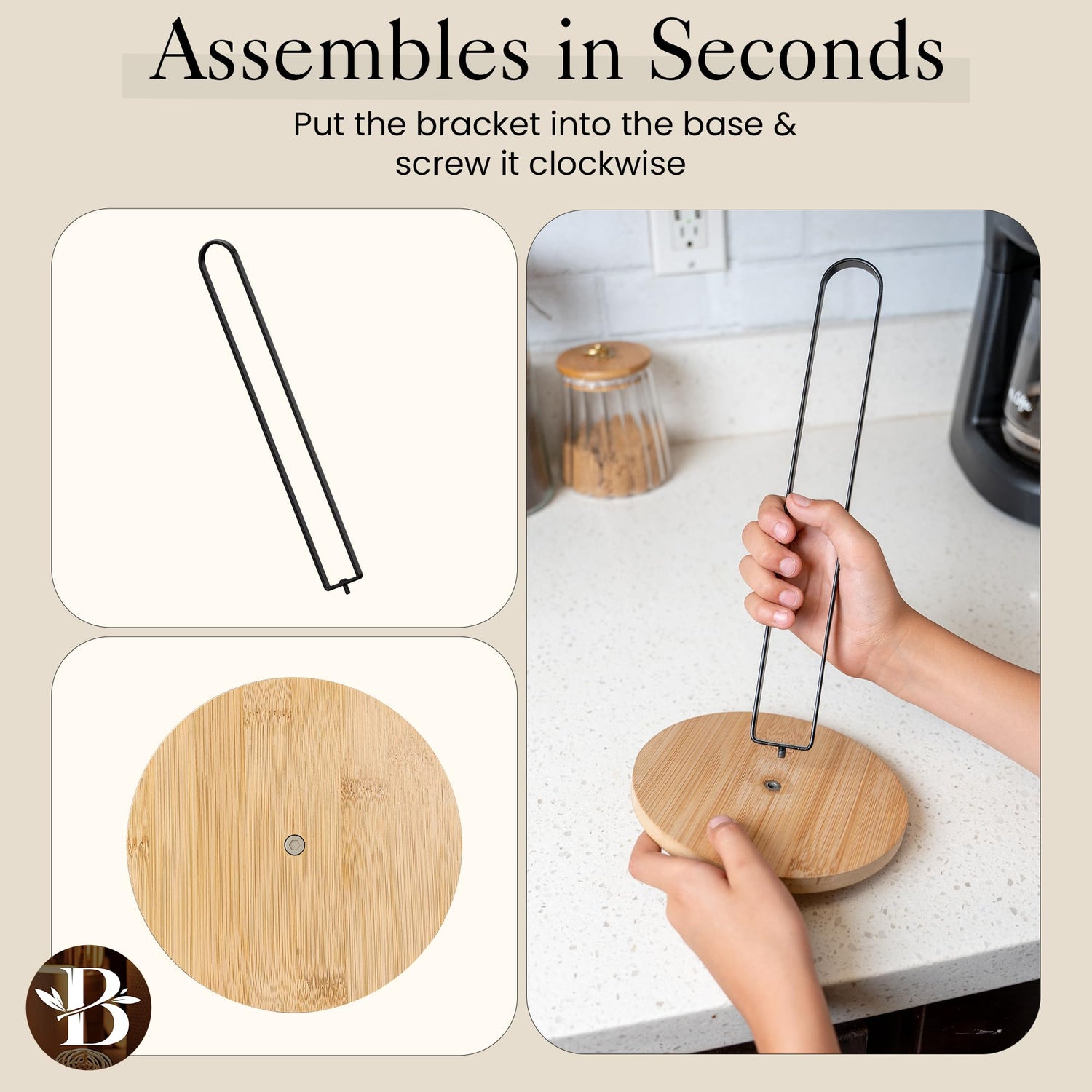 - Stylish & Durable Design: This paper towel holder has a sleek black rod and a natural bamboo color base, giving the wood paper towel holder a modern, minimalist look. It's built to last and is perfect for any kitchen or office.