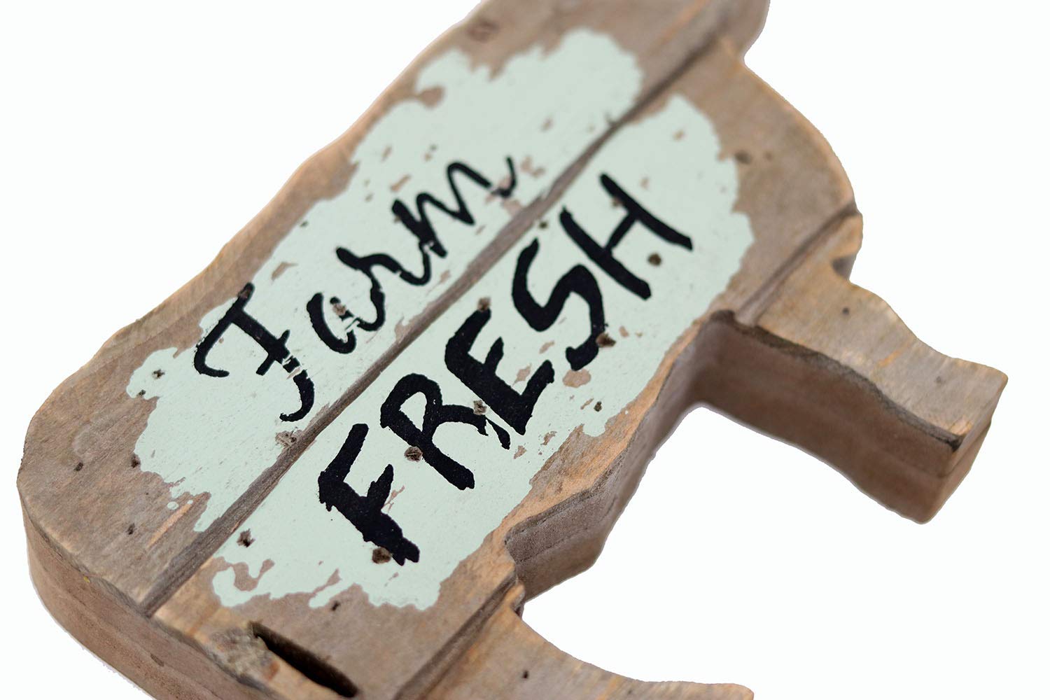 This wood tabletop decor features sentiment "Farm Fresh" in green background, cow shaped in distressed finish, vintage inspired.