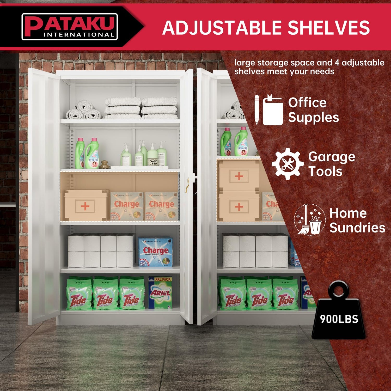 - 【Multifunctional large cabinet】Pataku 72-inch garage storage cabinet with doors and shelves. Each shelf of the garage cabinets can withstand a weight of 180 lbs. The adjustable shelves board can meet your storage needs for items of different sizes, which will bring more convenience. Lockable garage storage system cabinet is suitable for different locations, such as home offices, garages, pantry, Kitchen, tool room, classrooms.