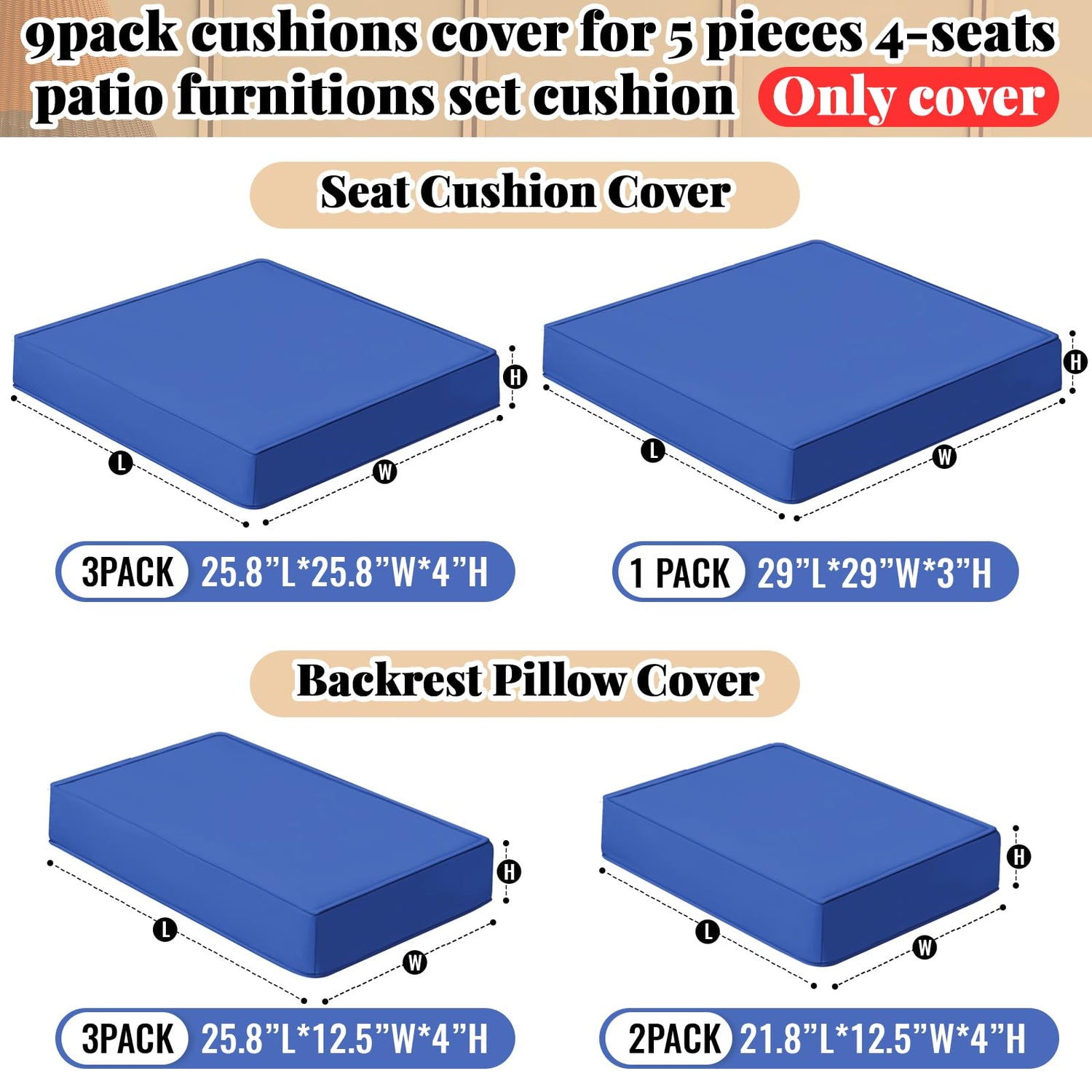 - Dimension and Quantity: this 9 pack patio replacement cushion covers set includes 3 integrated cushion covers (25.8''L x 25.8''W x 4''H), 1 pack outdoor couch cushion cover (29''L x 29 ''W x 3''H), 2 handrail covers (21.8''L x 12.5''W x 4''H) and 3 backrest covers (25.8''L x 12.5''W x 4''H), please note that replacement covers only, cushions not included