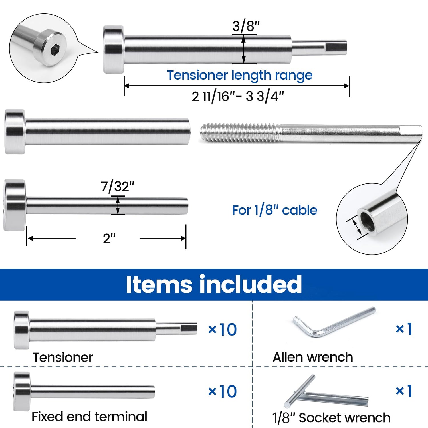 - Patented Invisible Design for 4"x4" Wood Post: With the patented invisible flattened tail design, the ugly swaged end can be hidden in the 4"x4" wood post(but cannot be hidden in 2"x2" posts), and get enough tension to pass 4”sphere test to meet code compliance. The customized socket wrench Muzata CT16 is essential for the invisible installation and keeps the cable from spinning when tightening. Package includes: 10 pairs of tensioners and terminals, 1pc allen wrench, 1pc socket wrench