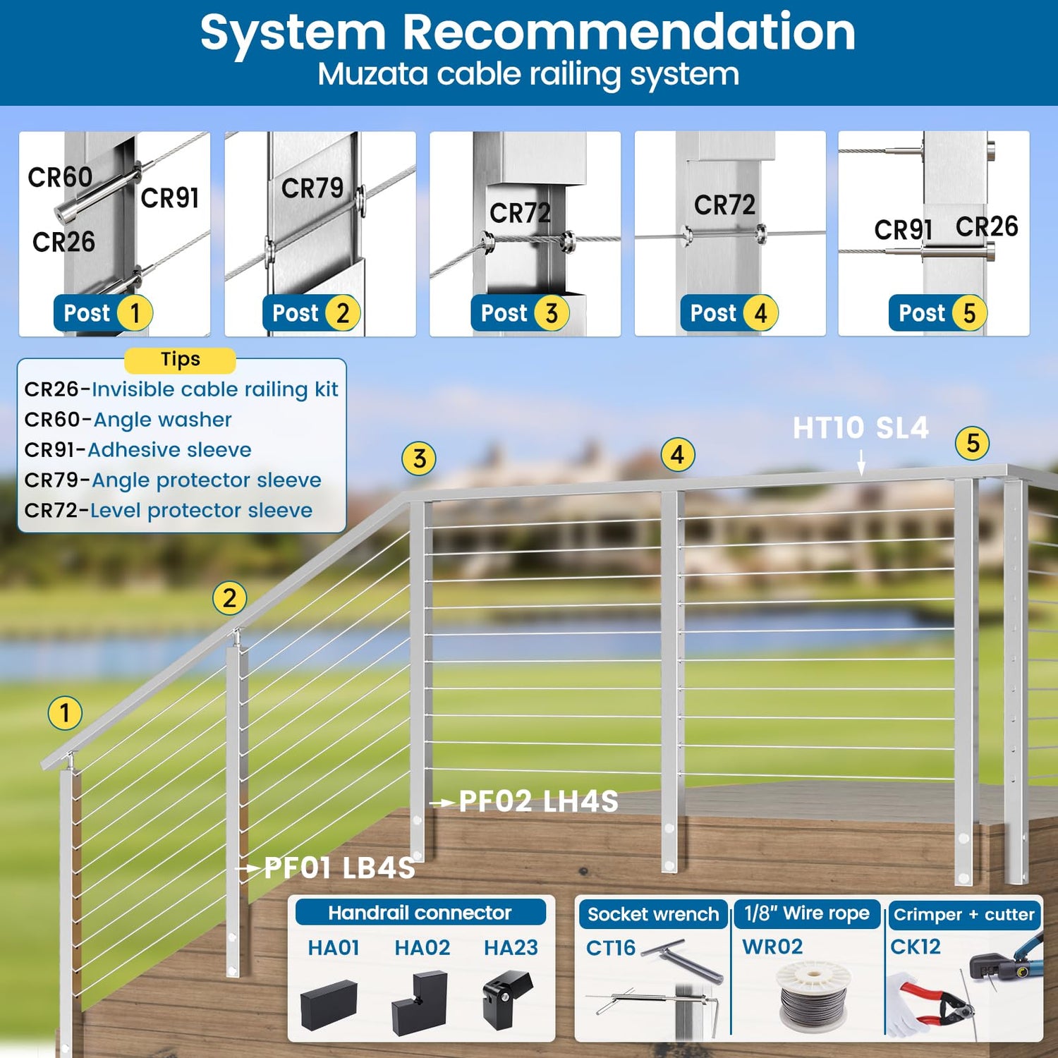 - Advice for constructing a system: To help you build a cost-effective Muzata cable railing system more efficiently, we recommend the following product combinations from Muzata, including cable railing posts Muzata PF01 PF02, handrail HT10, cable railing kit CR26, angle beveled washer CR60, adhesive sleeve CR91, angle protector sleeves CR79, level protector sleeves CR72, handrail connector HA01 HA02 HA23, 1/8" wire rope WR02, crimper and cutter CK12, socket wrench CT16
