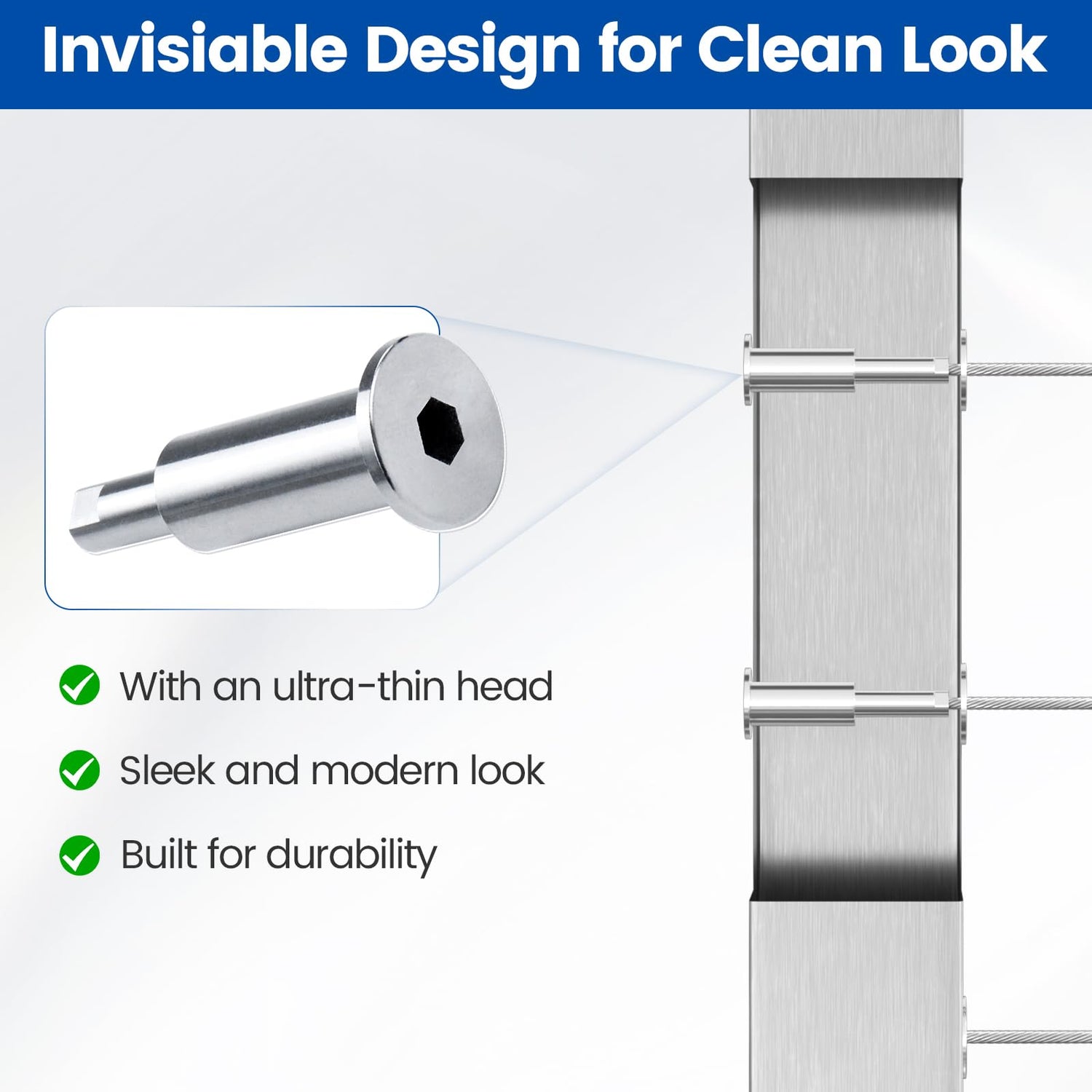 - Completely Invisible: Muzata invisible cable railing kit CB40 has a thinner flat head,which has been professionally treated to ensure a smooth,burr-free finish.The patent design of the flat tail ensures effective tensioning while completely hiding ugly crimp marks in the 2”x2” metal posts,providing a clean look for your cable railing projects. Package includes: 40pack of tensioners, 1pc allen wrench, 1pc socket wrench, 40pcs adhesive sleeve, 60pcs adhesives