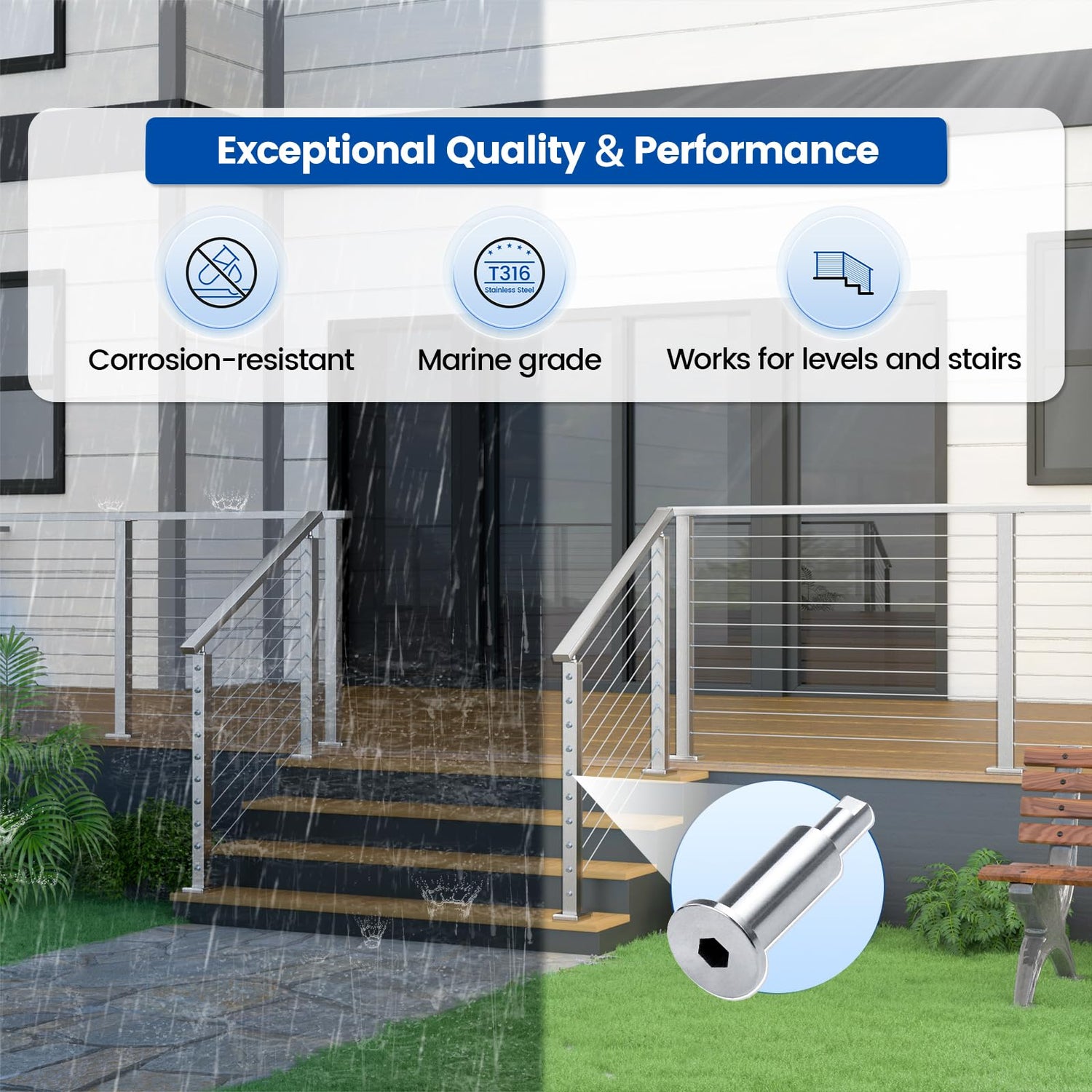 - T316 Marine Grade: This invisible cable railing tensioner is made of T316 stainless steel, which is perfect for indoor, outdoor and coastal applications. This high quality deck cable raling kit is rust-resistant, corrosion-resistant and durable