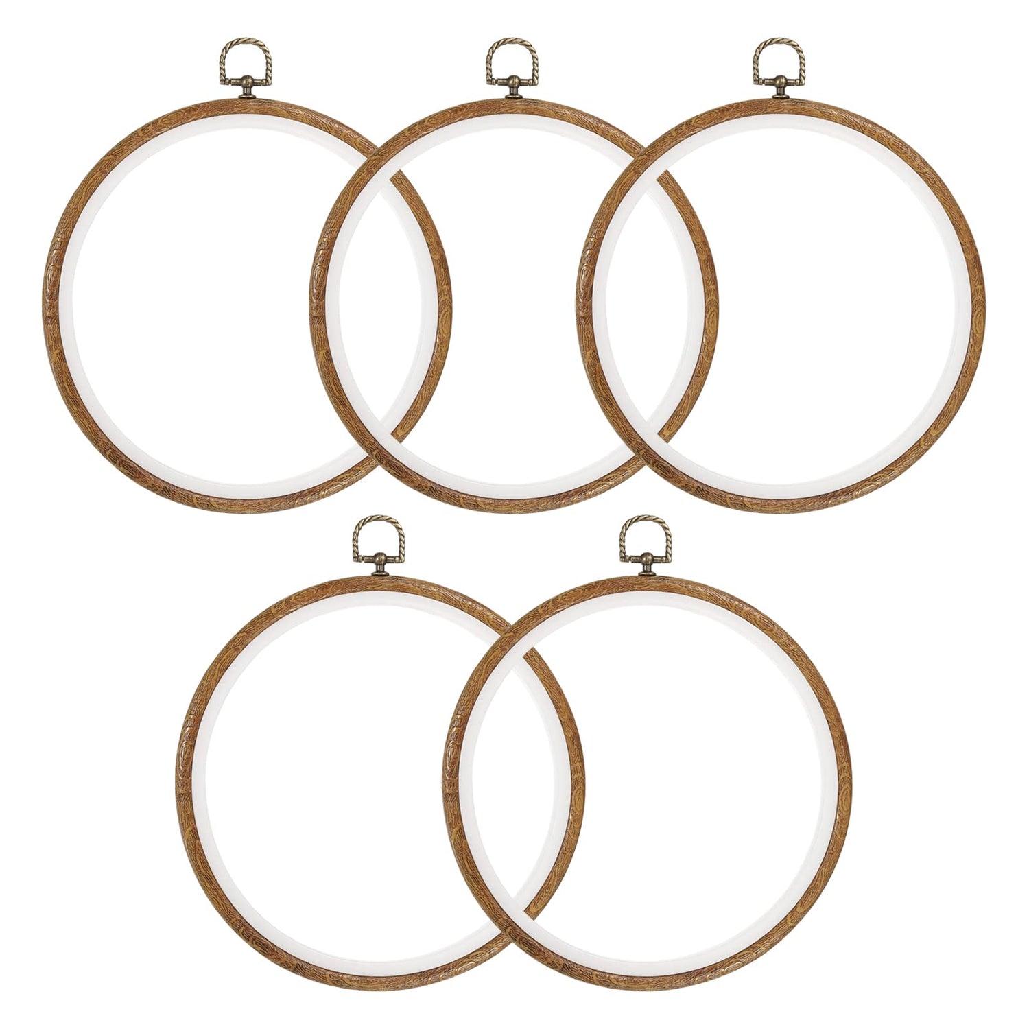 - Durable Material: Our cross stitch hoop frame is made of rubber plastic, durable and flexible, with good compression resistance, the outer resin hoop has good elasticity and can be easily twisted into an "8" shape to return to its original shape. Retro brass hanging ring with wood grain makes handcrafts more exquisite, anti-skid texture offers a comfortable grip.