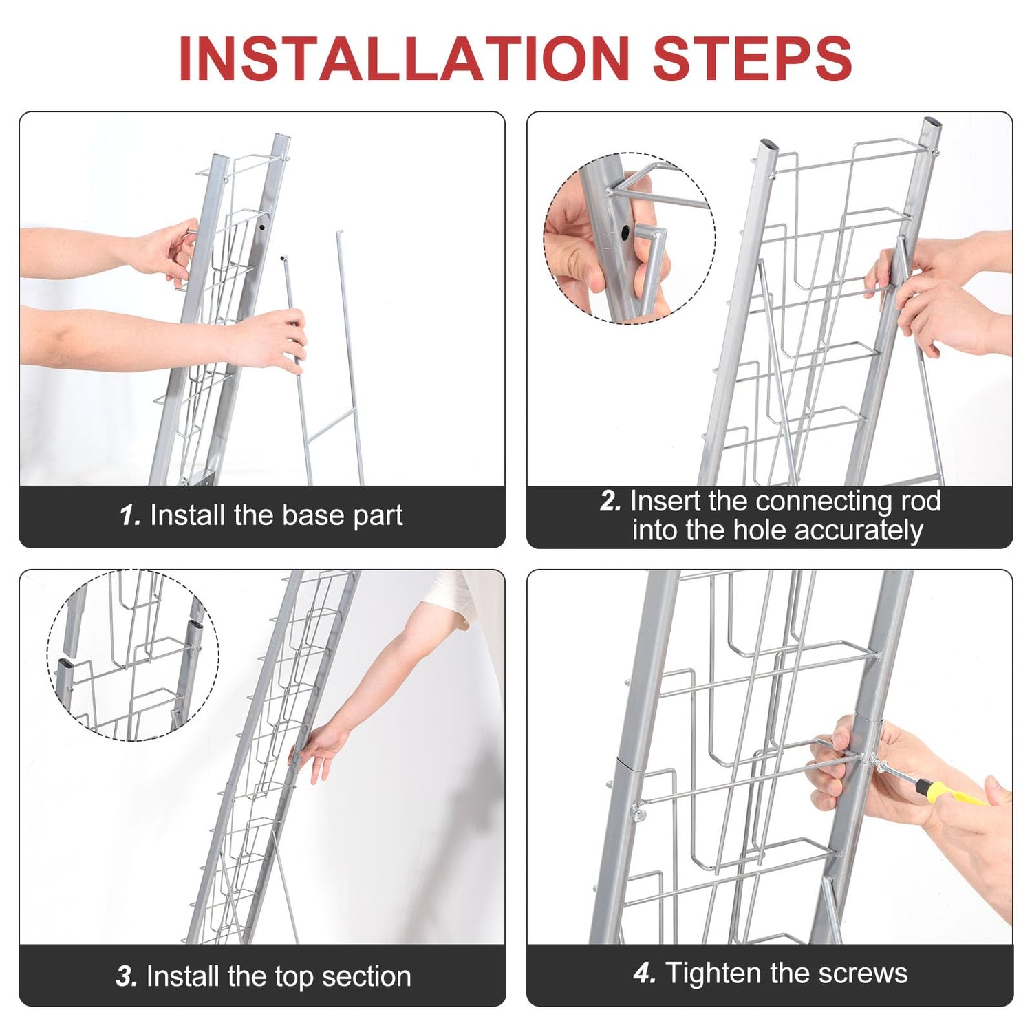 - Detachable Rack: The detachable design of this magazine display rack allows you to store the display stand in seconds and comes with a screwdriver. Unfolded Size(150 x 36 x 25.4cm / 59 x 14 x 10 inch)