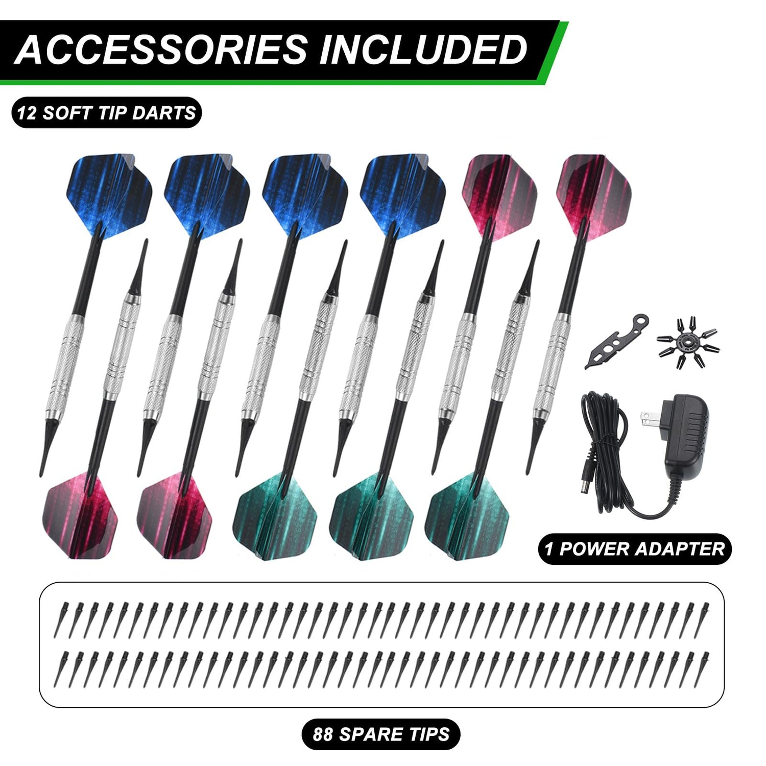 - Included Accessories: We provide 12*Darts (with tail wing model: P6502+P6501+P6506+P6503), 88*Dart tips, 1*Dart wrench, 1*Dart blade protector, and 1*US Adapter, ensuring that you have everything you need to start playing right away. Great for use at home, in bars, or at outdoor events.