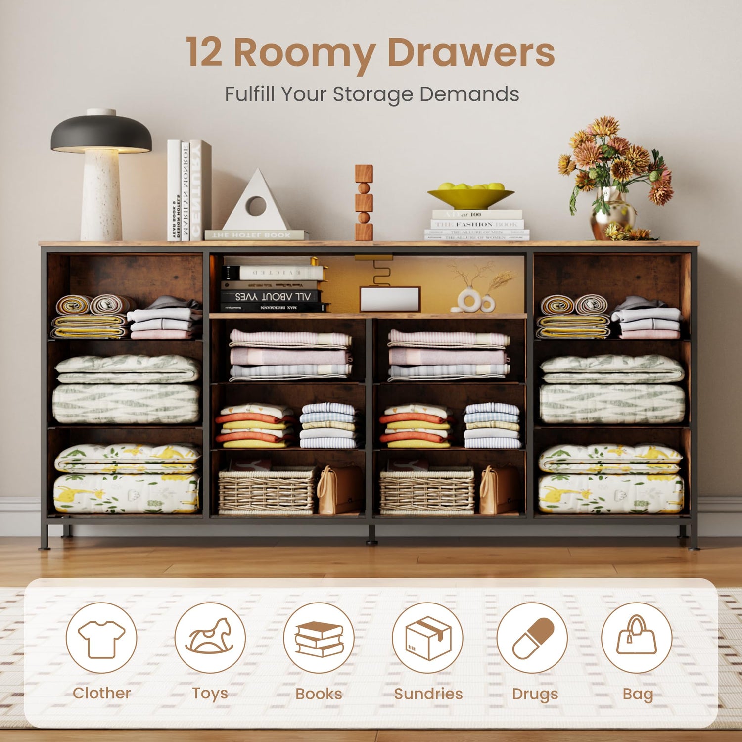 - 12 Drawer Dresser with Open Shelves: This fabric dresser and TV stand with storage features 6 large and 6 medium drawers plus open shelves, providing versatile space to organize clothes, media devices, and accessories. Perfect as a bedroom dresser, closet dresser, or wood clothes dresser