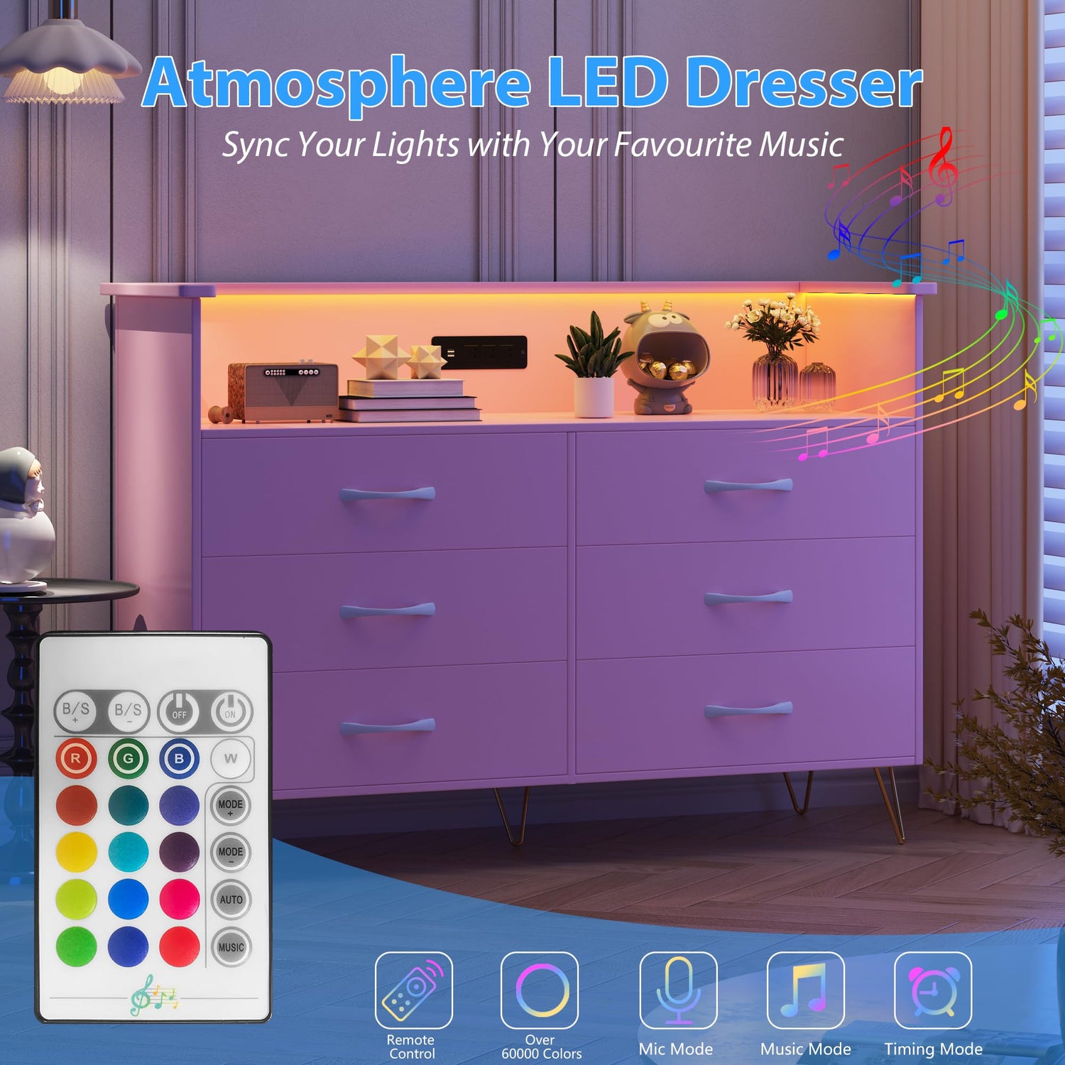 - 【Dynamic RGB Mood Lighting】Experience ambiance enhancement with the wooden dresser's built-in multi-color LED strip, adjustable for brightness and capable of showcasing a spectrum of hues. Explore various lighting modes tailored to your mood or event, and enjoy a touch of magic as the LEDs synchronize with music from the accompanying app, creating a rhythmic light show.