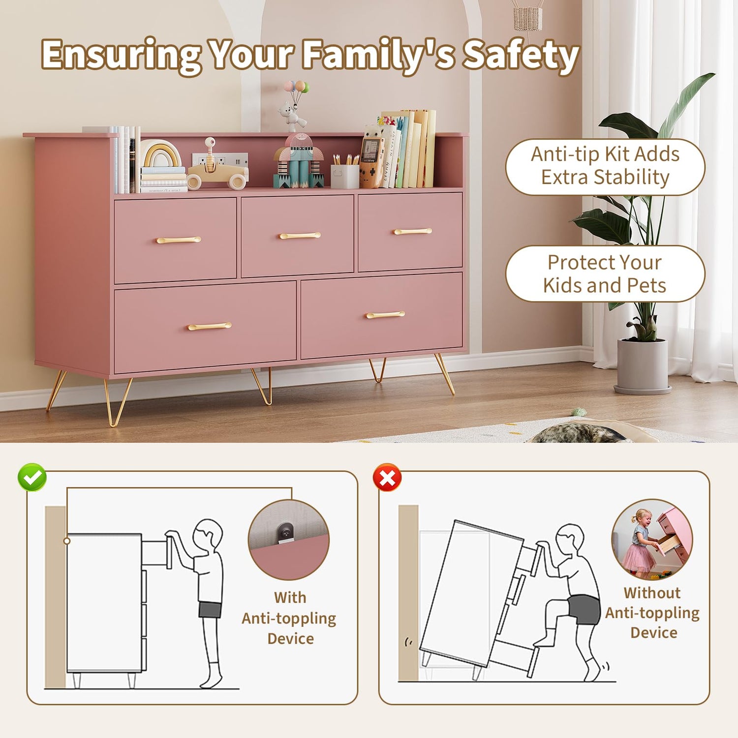 - Spacious Drawers & Secure Raised Panel: Five deep drawers provide generous room for accessories, clothing, or toys. The spacious tabletop features a three-sided raised panel, keeping books, lamps, or decorations secure and within easy reach—no more falling items