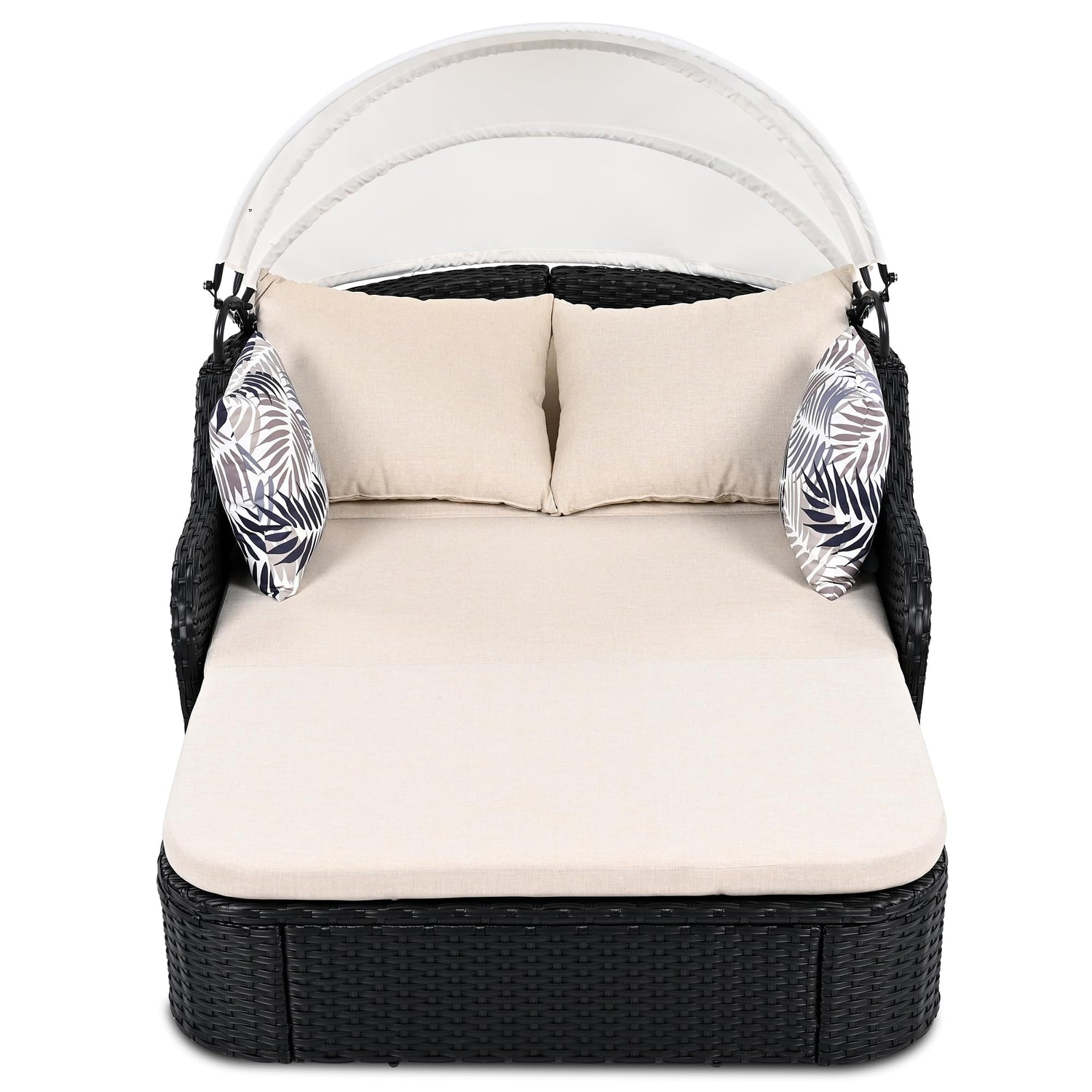 - [Luxurious Pillow Arrangement]: Enjoy the luxury of plush cushions with our outdoor daybed. It comes complete with two large beige pillows for comfort and two colorful decorative pillows for a pop of style. No need to bring extra pillows; everything you need for a cozy experience is included.
