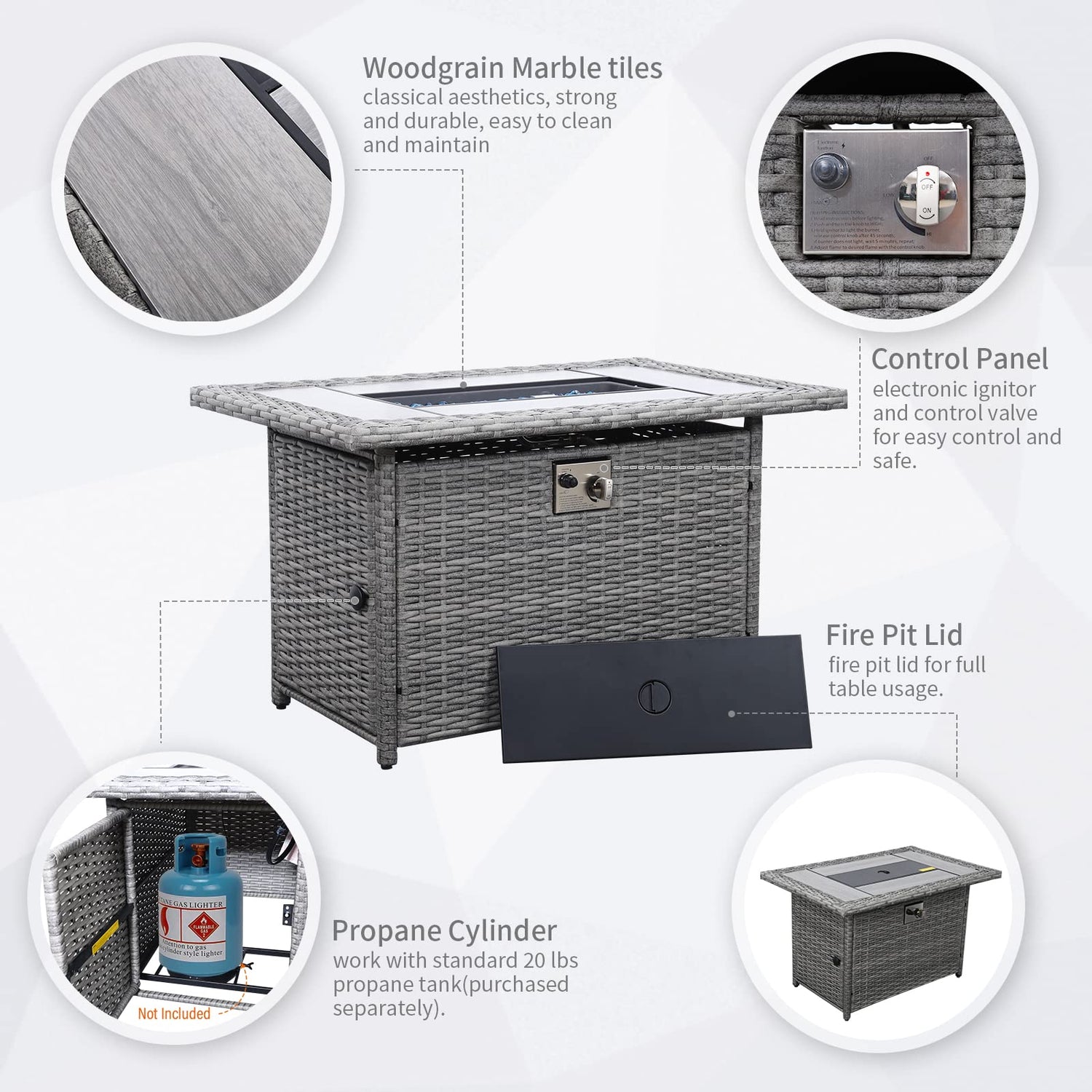 • Patio Fire Pit Table: 60000 BTU outdoor fire pit table equipped with standard 20lbs propane tank(need purchased separately), a coffee table after closing the fire lid and surrounding the woodgrain marble tile tabletop, extend the use scenario and enjoy the great outdoors. Wicker outer frame, stainless steel burner, and blue crystal beads in which flame dances, all of them ooze a cozy and warm feel, creating a wild-joy resort on the patio with the gas fire table ensemble.
