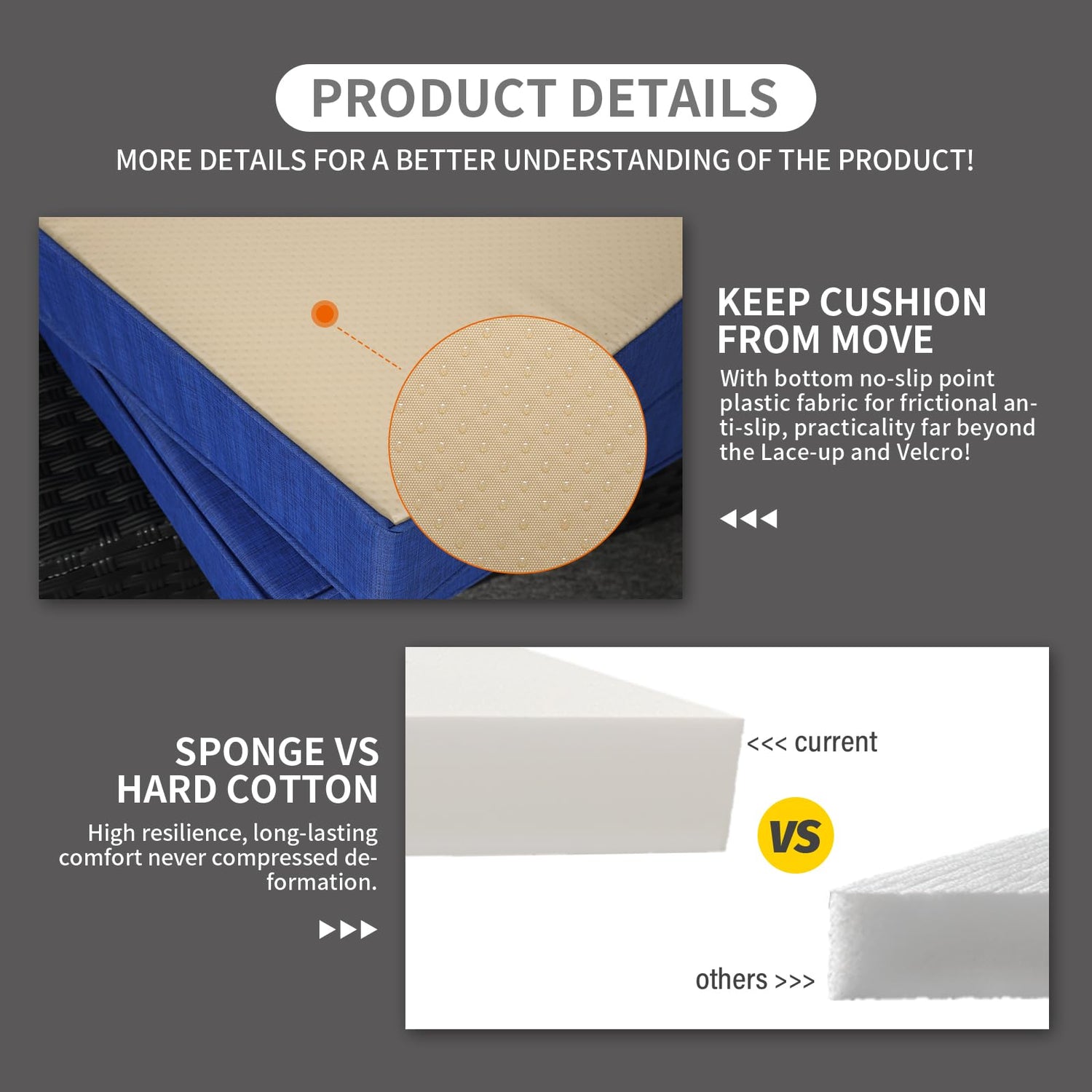 - Comfortable and Non-slip: thickened seat cushions(4 inches) with high resilience sponge and bottom anti-slip dotted plastic fabric, anti-slip and practicality are wholly better than lacing, velcro or hook; match up filling back cushions, which is extraordinarily comfortable and everlasting with outdoor patio furniture