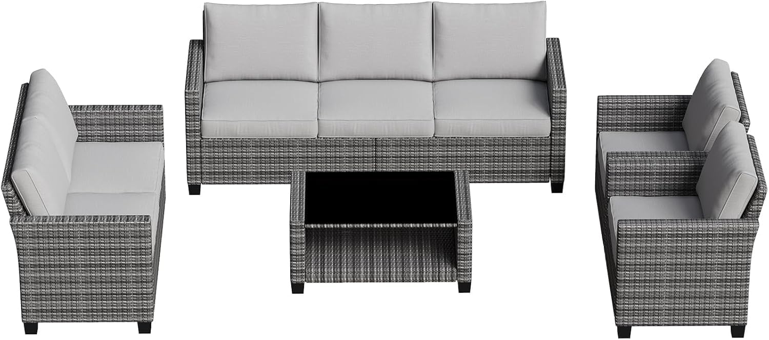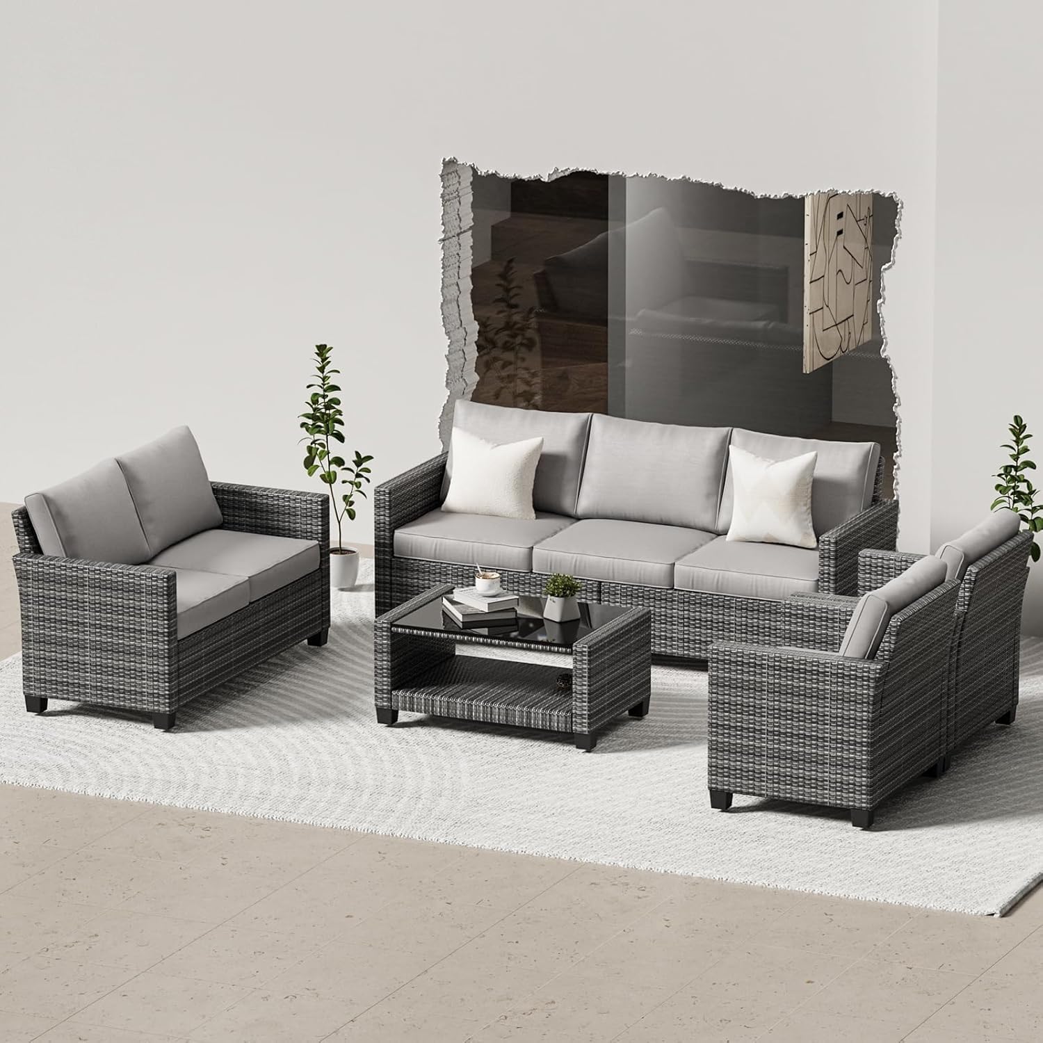 Patio Furniture Sets 6 Pieces, PE Wicker Modern Patio Conversation Set with Storage Cushions for Poolside, Deck, Balcony, Grey + Earthy Grey
