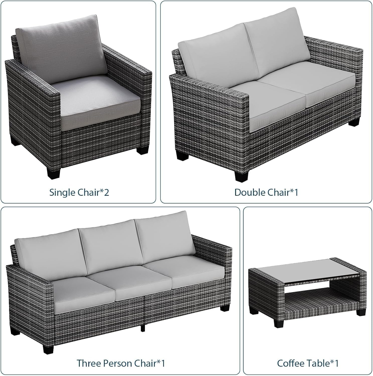 - 【All-Weather Durability】Crafted with heavy-duty powder-coated steel frames and premium UV-resistant PE rattan wicker, this 5-piece patio furniture set withstands extreme weather conditions—rain, snow, and intense sunlight. Reinforced rust-proof construction ensures long-term durability for outdoor use in gardens, poolside, or backyards. The all-weather synthetic resin cushions feature fade-resistant, machine-washable covers with splash-proof technology, maintaining comfort and aesthetics year