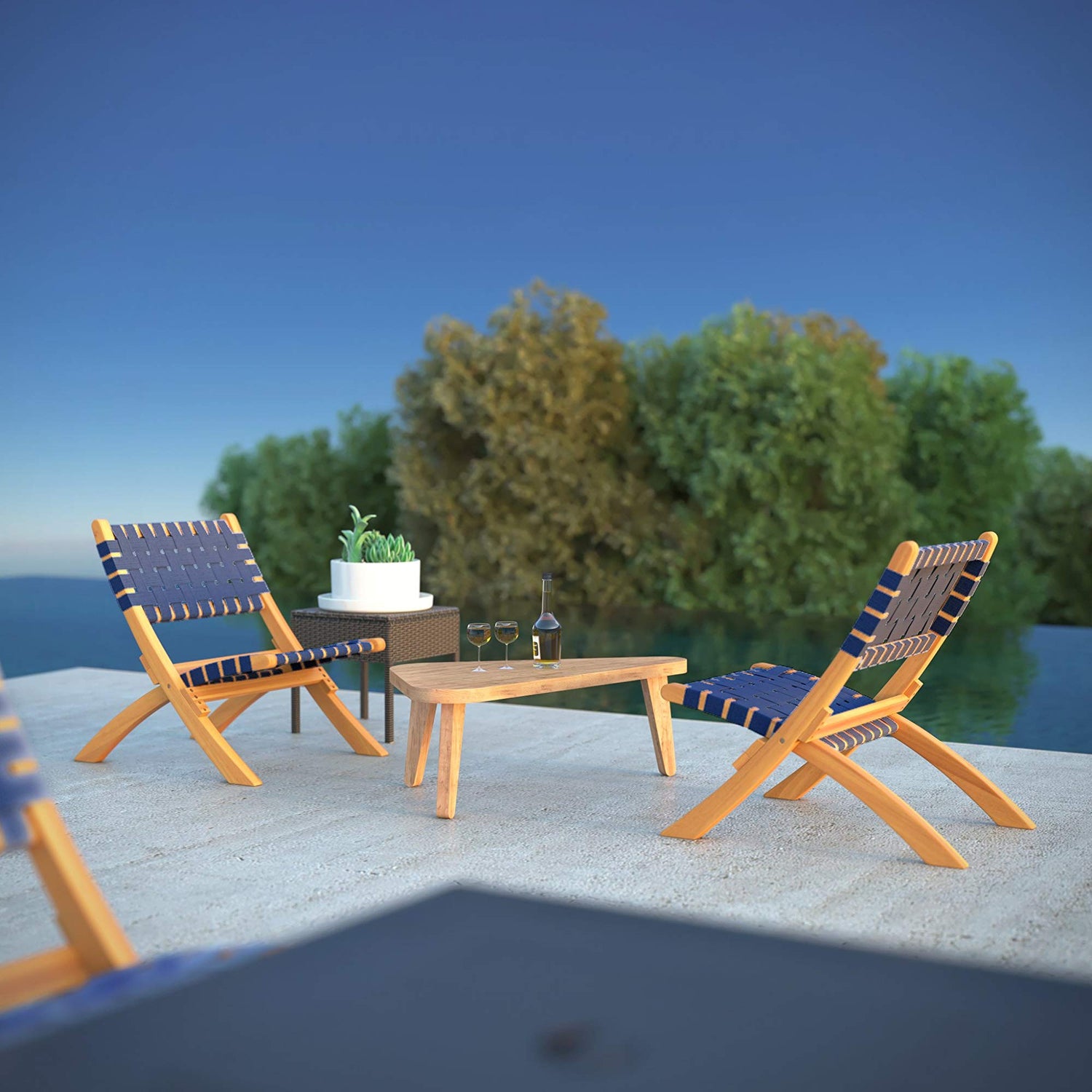 - SAVA INDOOR OUTDOOR FOLDING CHAIR IN NAVY BLUE WEBBING: The attractive teak-toned finish is the perfect accent for any patio or indoor living area, and also conveniently folds for storage or transport.