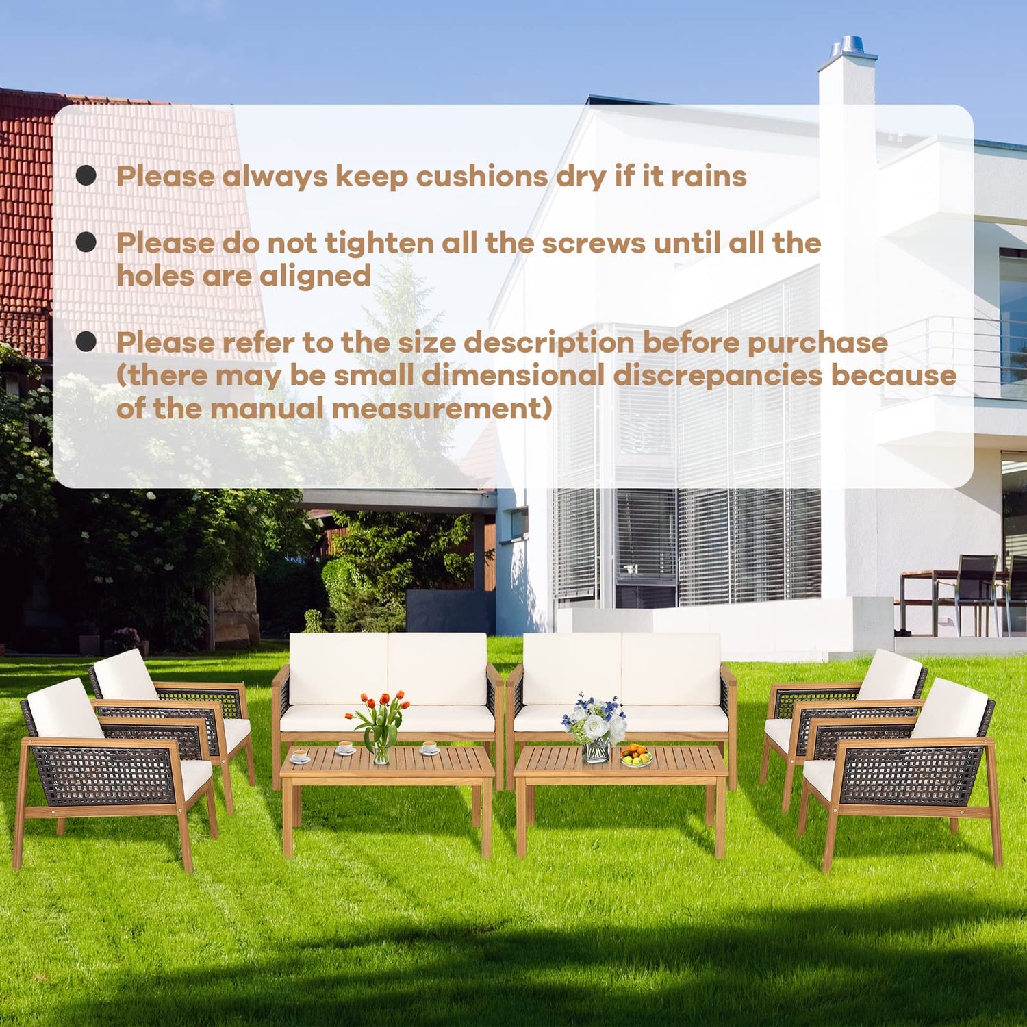 PATIOJOY 4 Pieces Outdoor Acacia Wood Furniture Set, PE Wicker Conversation Set with Coffee Table and Soft Cushions, Sofa for Garden, Poolside and Backyard (1, Off White)