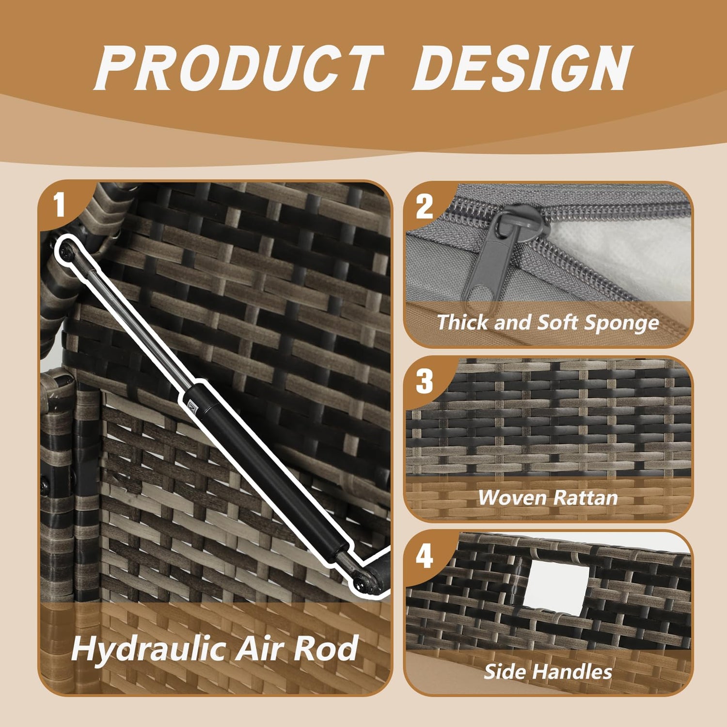 - Functional design: This wicker patio storage box features side handles for easy movement to your patio, yards, lawns, poolside, balconies, etc. Premium pneumatic rods enable the top to completely open and shut slowly with minimal effort.