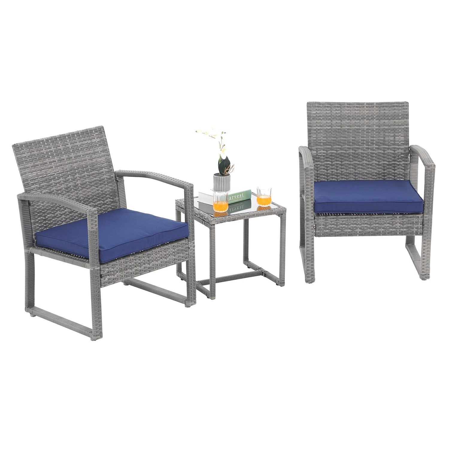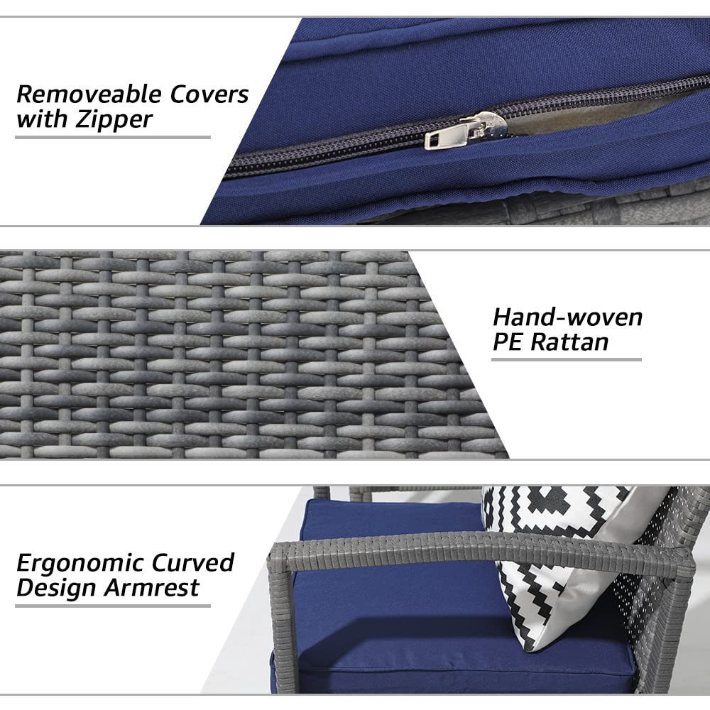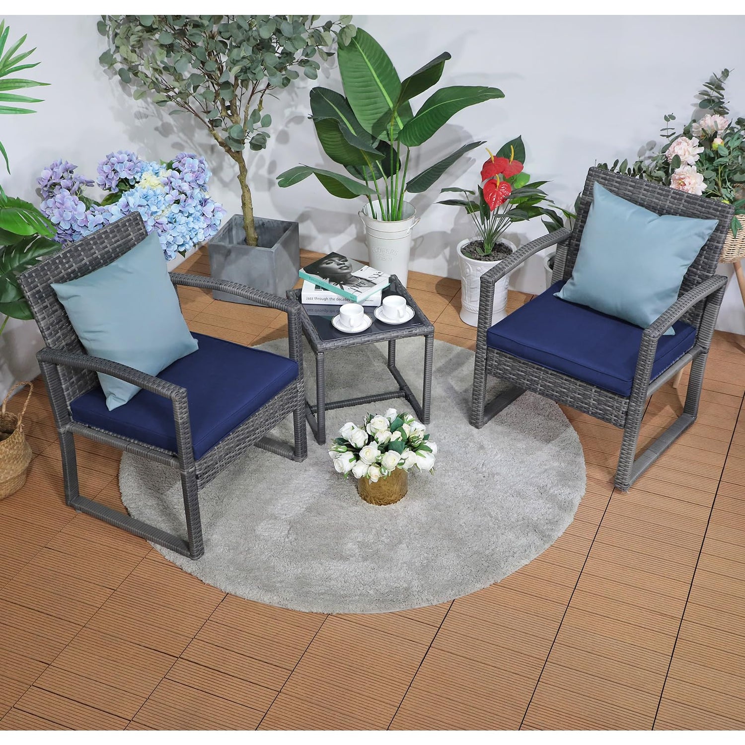 Patiorama 3 Pieces Outdoor Patio Furniture Set, Outdoor Wicker Conversation Set, Patio Rattan Chair Set, Modern Bistro Set with Coffee Table, Garden Balcony Backyard Poolside (Navy Blue)