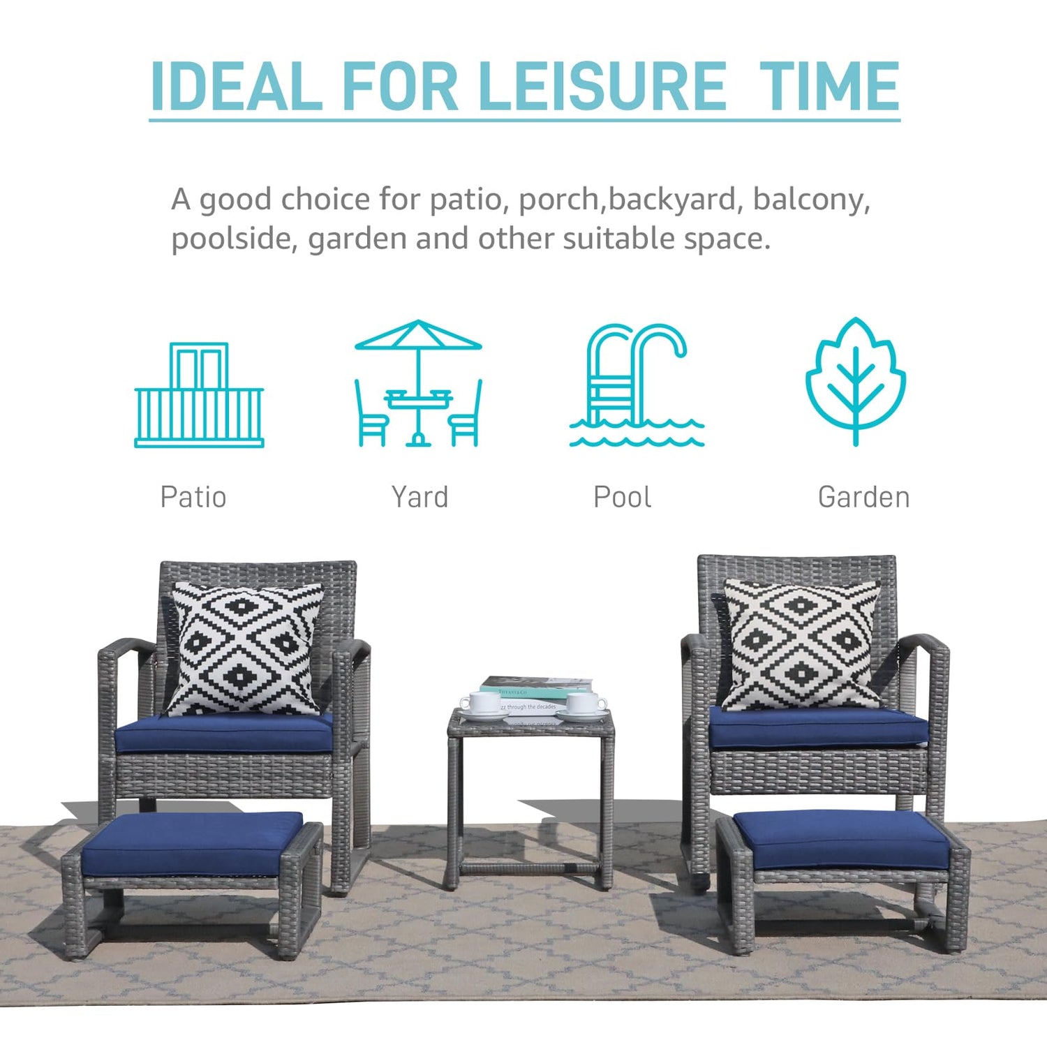 - [Space Saving Design]--2 ottomans with thick and soft cushions, provide you with an extra space for sitting or resting your feet. It can also be stored under the chair for less space occupied. Playing the role of sofa and chair, this set is ideal for a garden, lawn, porch, poolside, balcony, or any indoor and outdoor space.