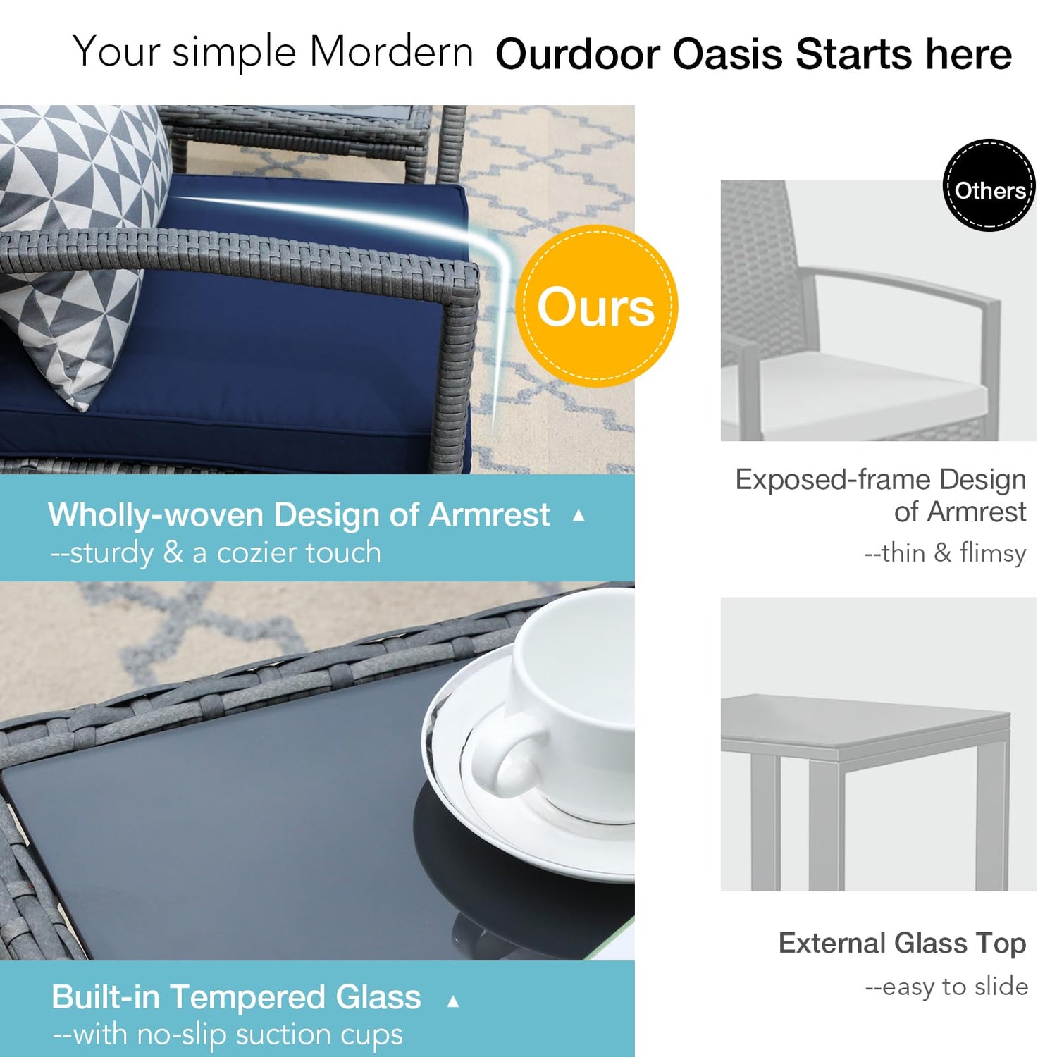 - [Built to Last & Wholly-Woven Design]--Made of a sturdy powder-coated steel frame, UV and weather-resistant PE resin rattan wicker, the armrest is completed with a unique wholly-woven design for a softer and cozier touch. All of this makes the 5 Pieces Outdoor Conversation Set built to be sturdy and durable enough for a long service life.
