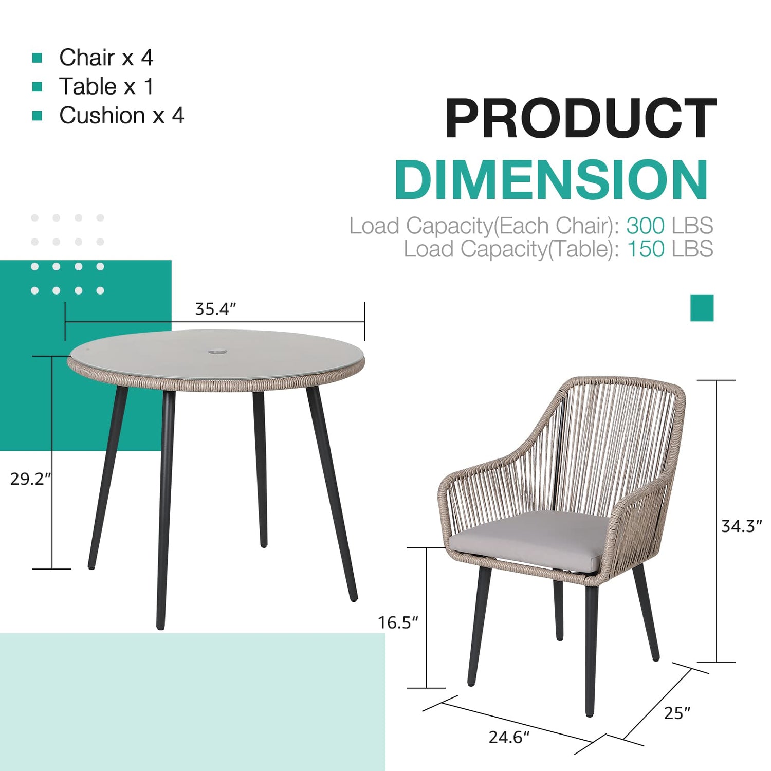 - ☕[Round Dining Table]: Featuring elegant tapered legs and hand-woven rope rattan, the round table was designed as the perfect outdoor table for up to four. Tempered glass table plus the outstanding 2'' umbrella hole design makes this outdoor table a perfect complement to any outdoor space.