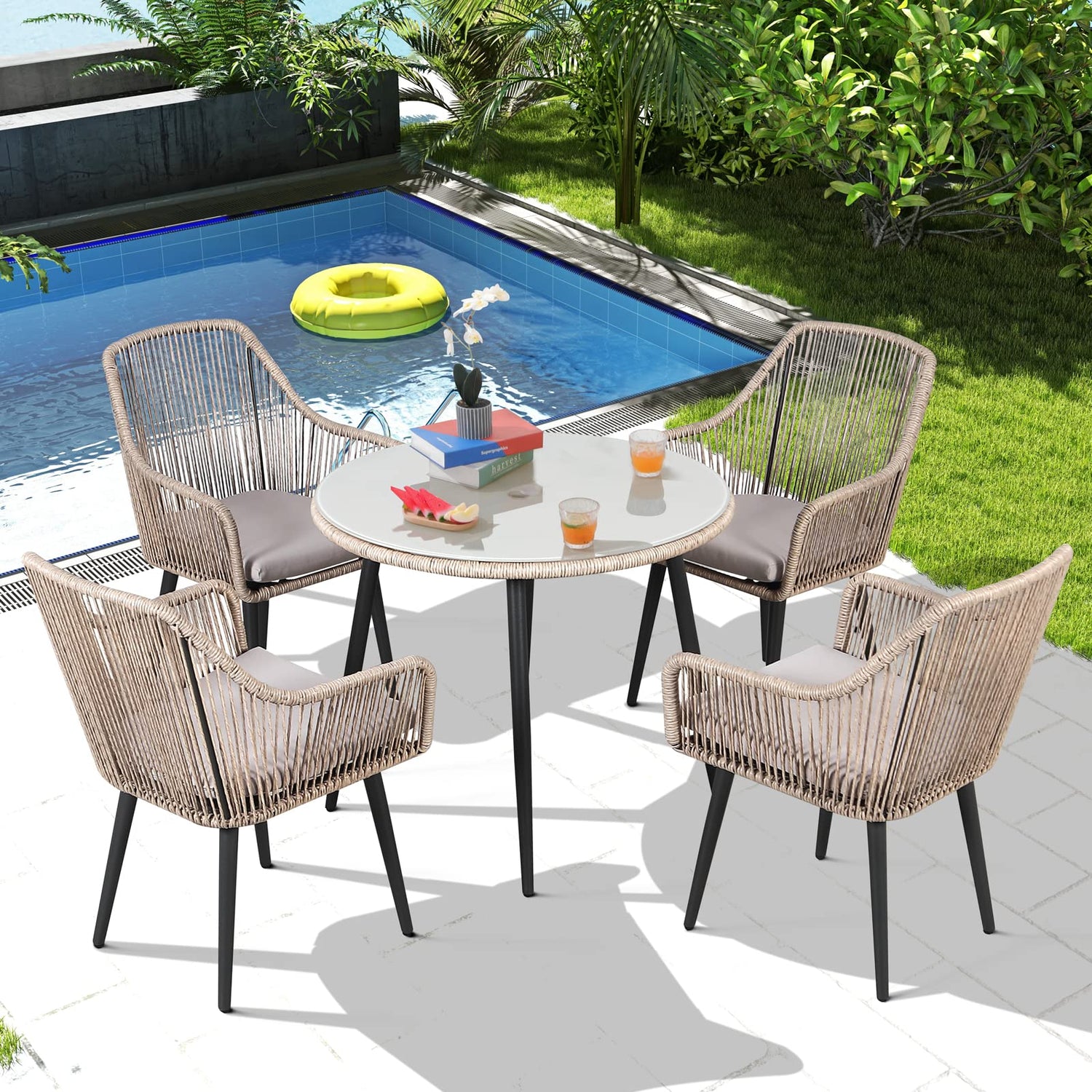 Patiorama 5-Piece Patio Dining Set, Outdoor Dining Table Chair Set, All-Weather Twisted Rattan Wicker Rope Conversation Set, Patio Furniture Set w/Umbrella Hole, 4 Cushioned Chairs&Glass Table(Tan)
