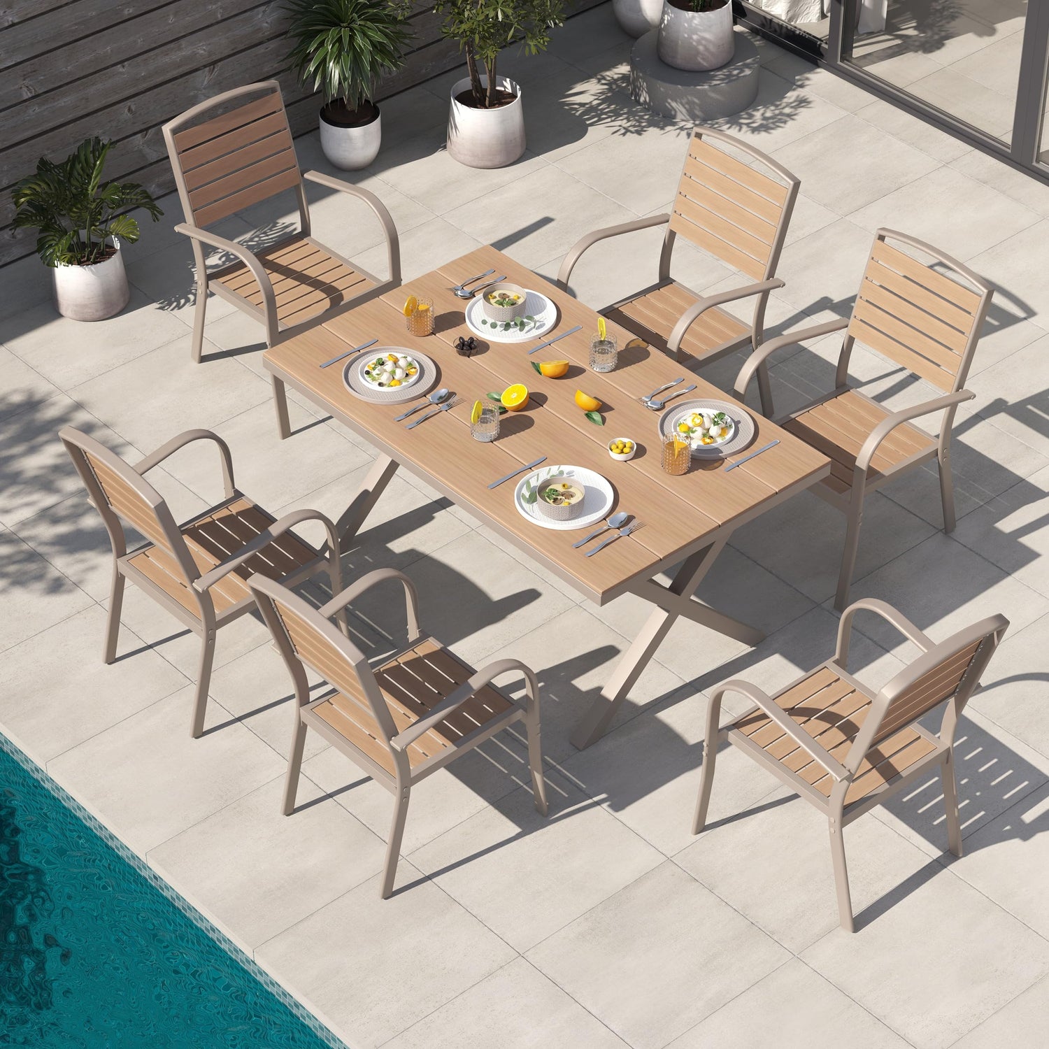 - 🍽️[Sleek Outdoor Dining Set]: With its faux wood-like texture chairs and table, combined with an aluminum frame, the 7-piece outdoor patio dining set offers great versatility as it is light enough to move easily and stack, yet sturdy. Create an inviting and sophisticated setup for your outdoor space and deliver an exceptional patio dining experience.