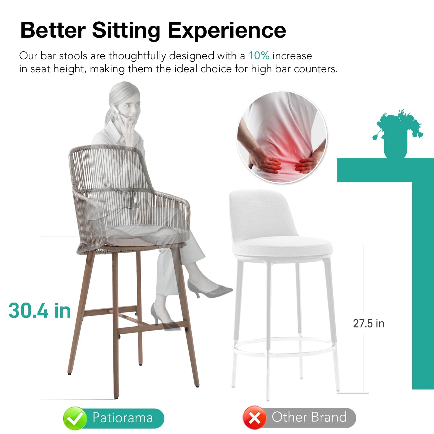 - đĽ¤ăEasy Assembly & Versatile Applicationă: Our outdoor bar stools can be assembled quickly in just a few easy steps. Counter Stools Dimension: 21.7â(D) x 22.3â(W) x 46â(H), seat height with cushion: 30.4â. Recommended for 42â to 46â height bar or bar table. Weight capacity: 330 lbs. Rattan bar height chairs offer a perfect blend of comfort and style, seamlessly fitting well indoors and outdoors, be it for a garden party, a porch gathering, or a poolside family dinner.