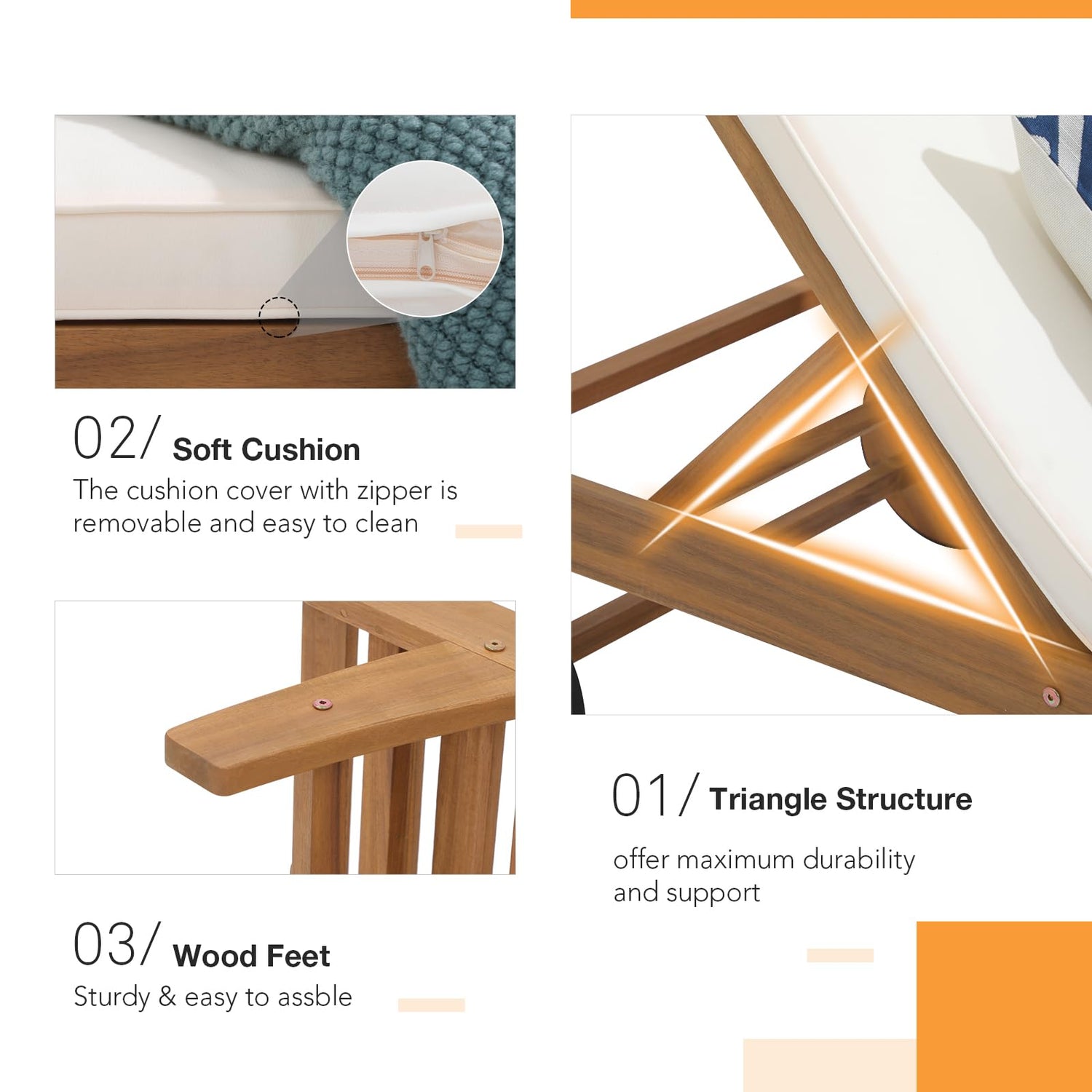 - 🌴[5 Position Adjustments]: The patio foldable lounge chair is easy to adjust, with 5 reclining positions (including the flat lay) to give you the best angle for reading, sunbathing, or napping, and it features a triangular support structure for stability. Take off the cushion and lie down directly in Summer, the modern and sleek slatted wood surface will bring you a cool and different feeling.