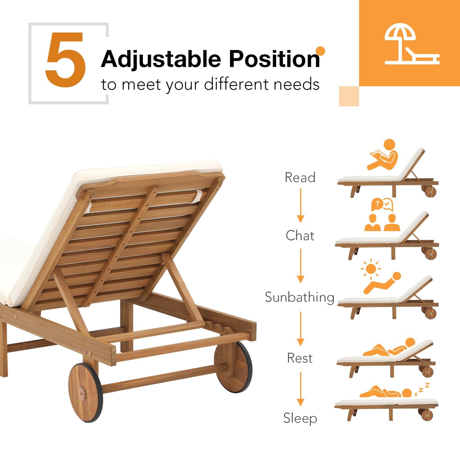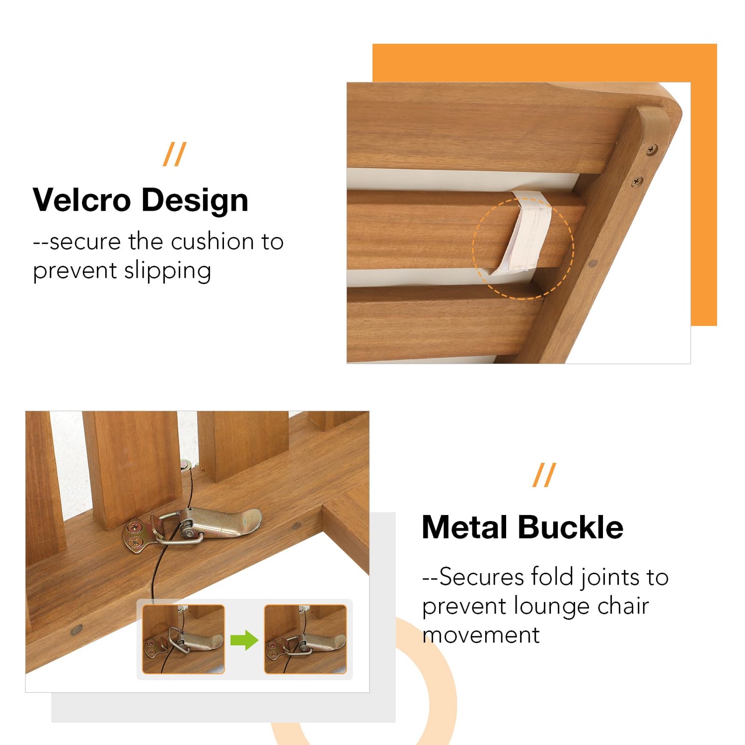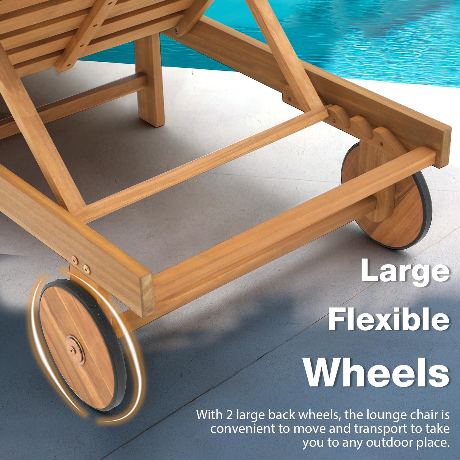 - 🌴[Folding Design with Built-in Wheels]: Our patio adjustable wooden lounge chair has a flexible folding design for simple storage and transportation that maximizes your outdoor space. When the outdoor sun lounger is open, simply secure the fold joints with the built-in metal lock to prevent its movement. 2 large wheels with thick rubber protection allow easy movement in your backyard, whether you prefer sun or shade.