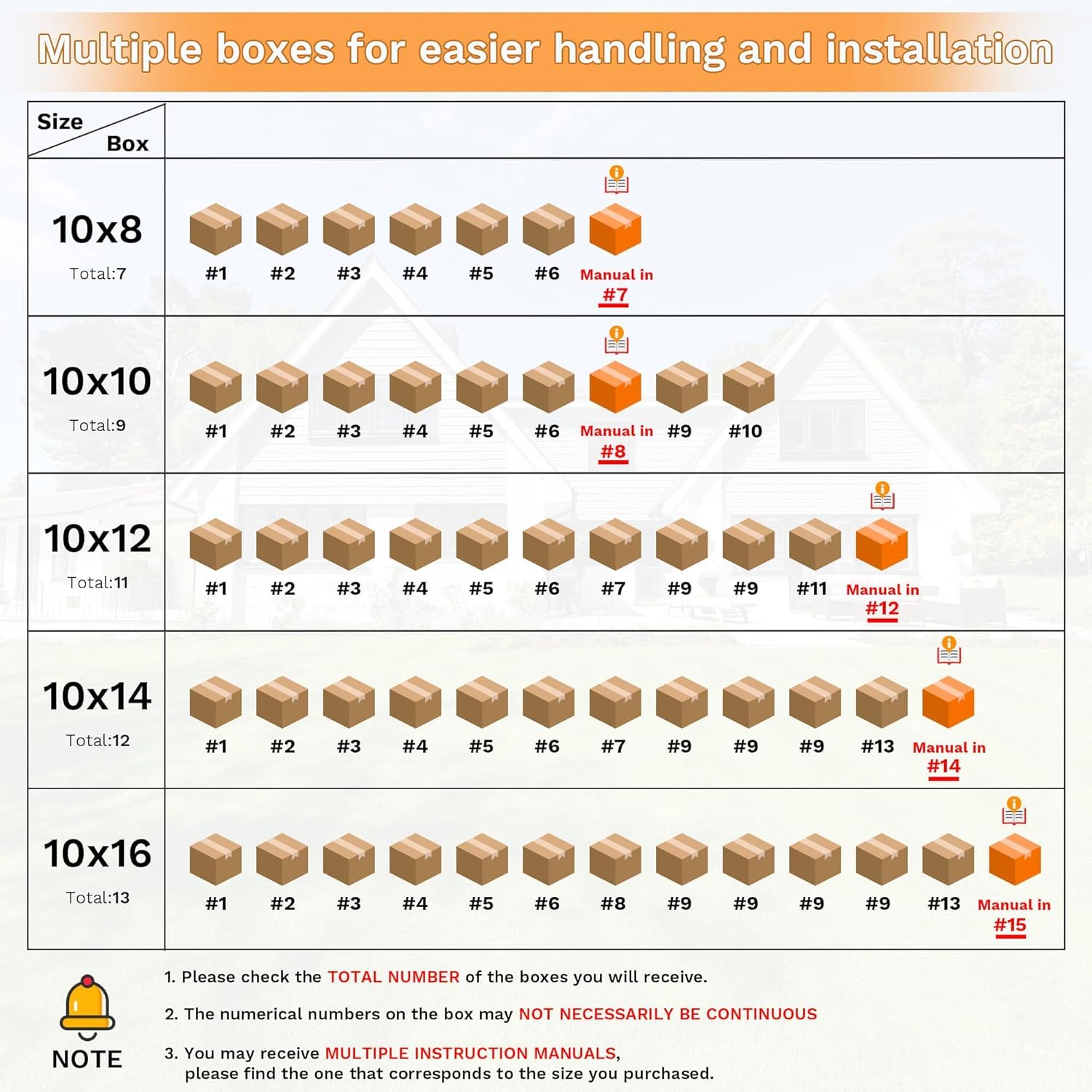 - Note: 1. Please check the policies of your community's homeowners association (HOA) to ensure that this project complies with relevant regulations. 2. The storage shed will be divided into 12 packages, numbered 1, 2, 3, 4, 5, 6,7, 9, 9, 9,13,14 which may be delivered in batches. You can scan the QR code on the package or contact us for information about other packages.