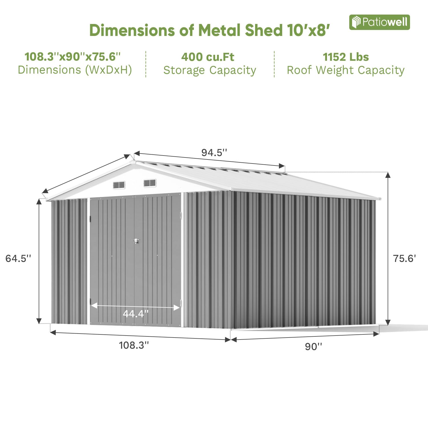 - Dimensions: The 10'x8' metal shed offers a total floor area of 85 square feet, providing sufficient space for storing garden equipment, tools, bicycles, and other items. With a peak height of around 6.3 feet, it offers ample headroom for most users to move comfortably inside.