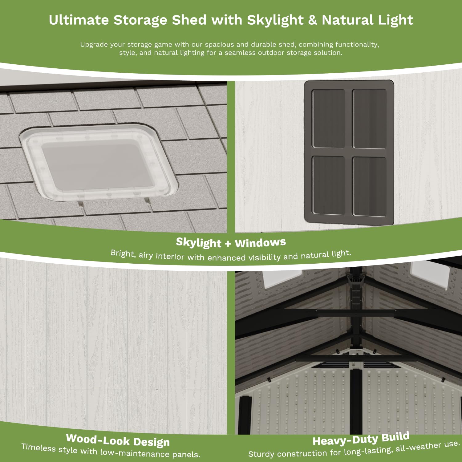 - Recyclable Resin Material: Crafted from thickened double-layer polypropylene resin, this plastic shed includes double UV protection to prevent sun fading. Its corrosion-resistant, seamless waterproof structure ensures all-weather durability, while the shed with floor prevents water damage and keeps items dry.