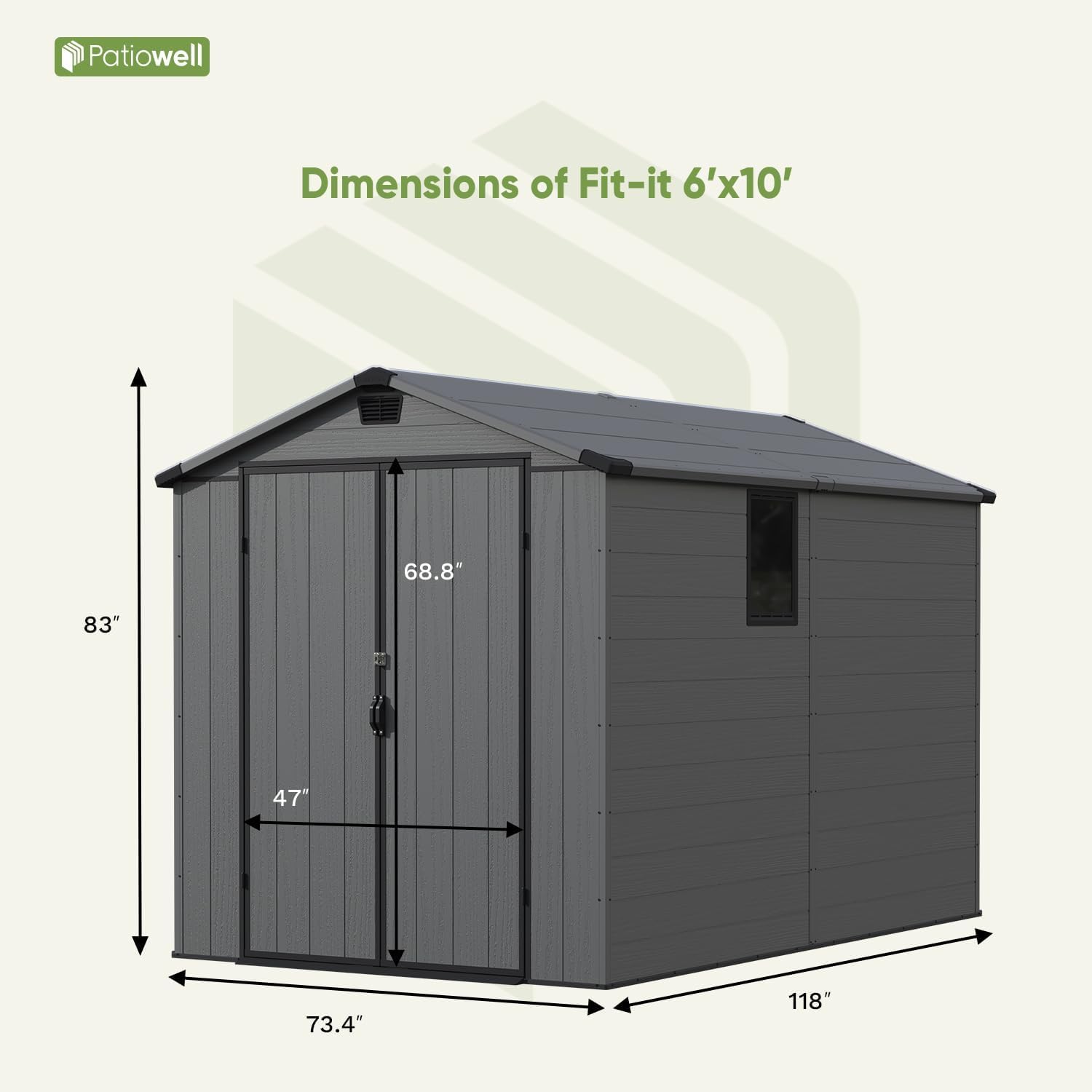- Spacious 6x10 FT Outdoor Storage Shed: This extra-large resin shed (73.4"L x 118"W x 83"H) delivers massive storage capacity for all your outdoor needs. The roomy interior easily fits lawn mowers, bikes, and bulkier items with space to spare.
