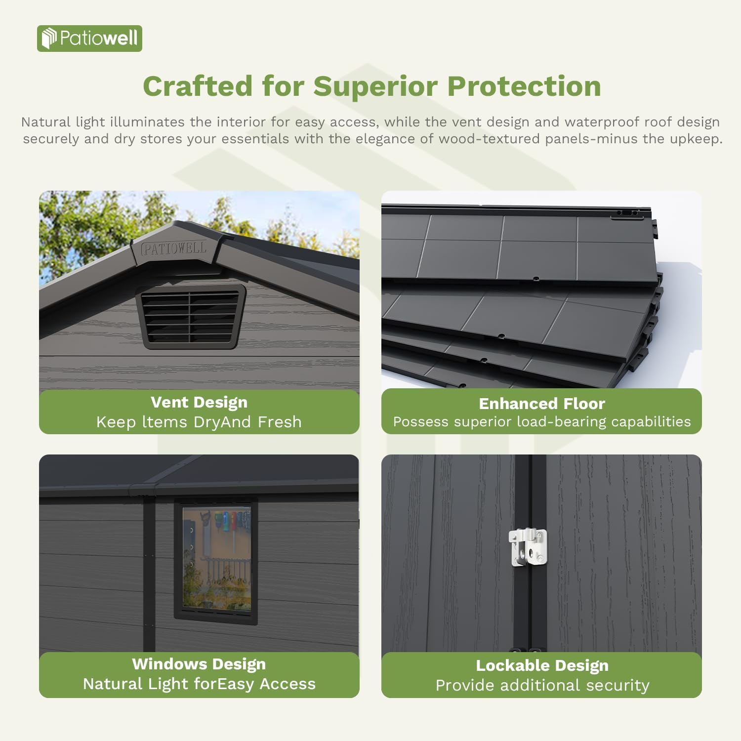 - Sturdy & Reliable Foundation: Built for strength and stability, this shed features a thick reinforced resin floor and heavy-duty frame designed to support even bulky equipment. The textured anti-slip surface maintains secure footing on uneven terrain while keeping stored items clean, dry and protected from ground moisture.