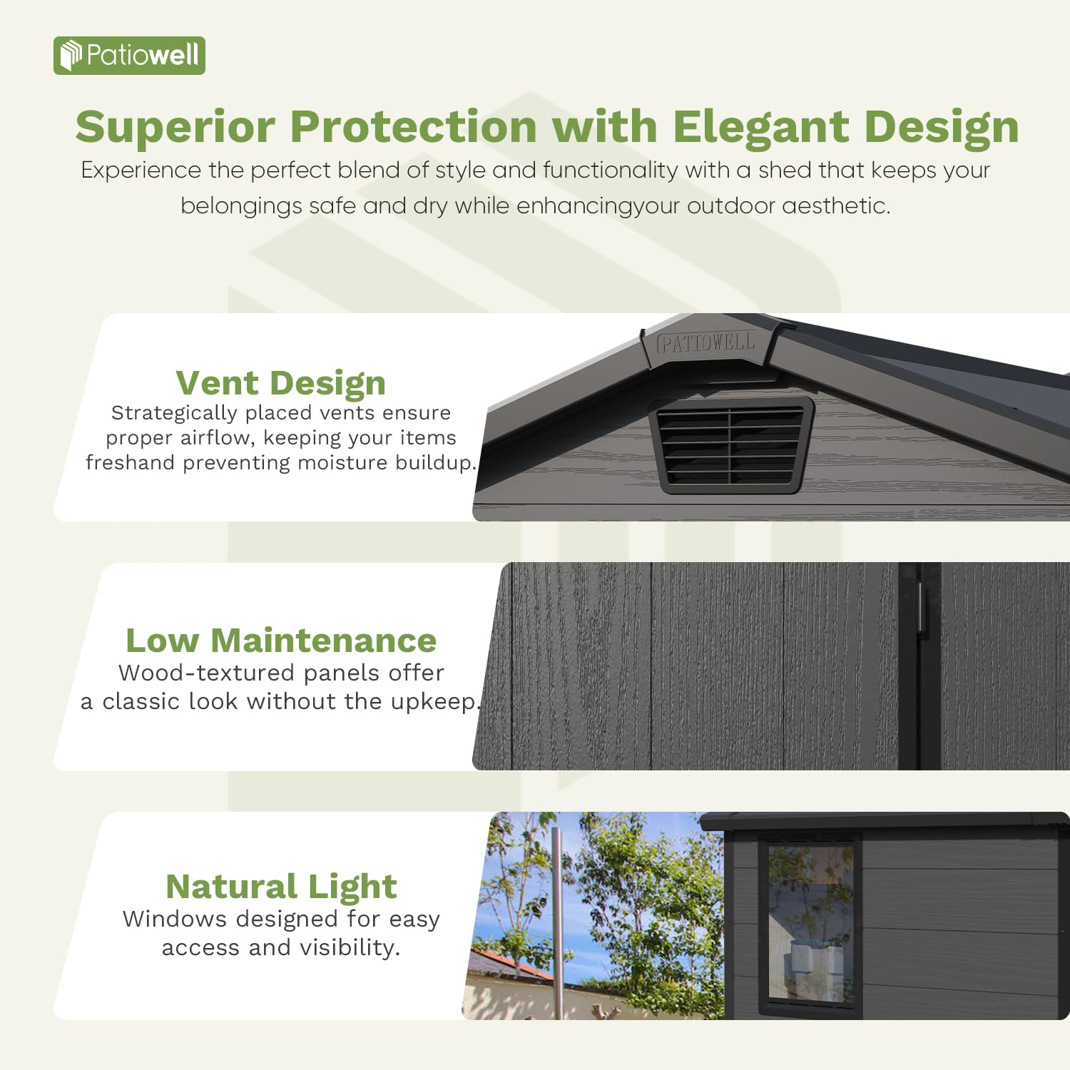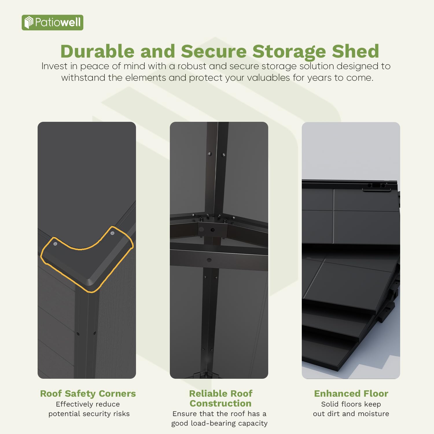 - All-Weather Durability & UV Protection: Crafted with UV-resistant, high-density plastic panels and a reinforced resin floor base, this garden shed withstands harsh sunlight, heavy rain, and strong winds. The anti-corrosion, waterproof materials prevent warping, cracking, or fading, ensuring long-term protection for your belongings.