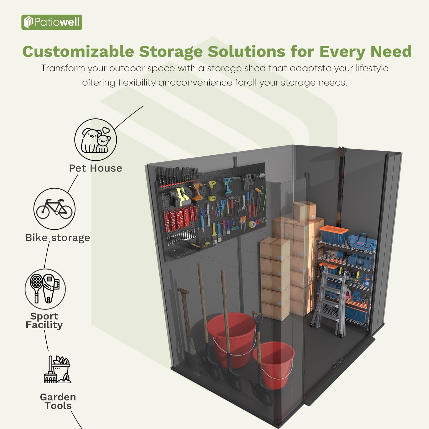 - Spacious 6x4 FT Multipurpose Storage: With 72.6"L × 46.5"W × 83"H dimensions, the Patiowell Shed effortlessly stores lawn mowers, bikes, garden tools, and patio furniture. Its high ceiling and open layout maximize vertical/horizontal space, doubling as a greenhouse, workshop, or pet shelter.