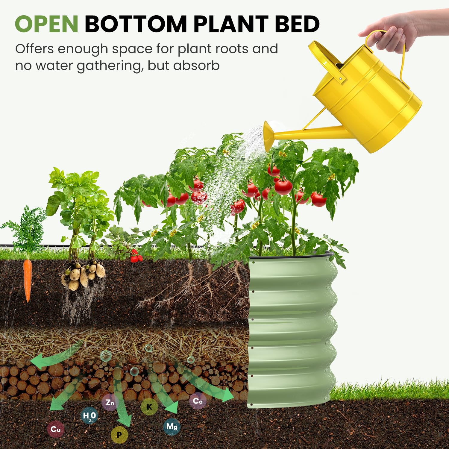 • Open bottom: Our raised garden beds outdoor is design with an open base. Bottomless design can effectively avoid water accumulation and root rotting. In the meanwhile, plants roots are allowed to absorb nutrients from soil to grow better.
