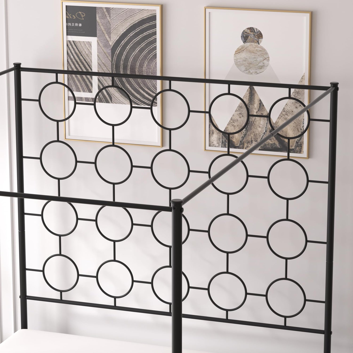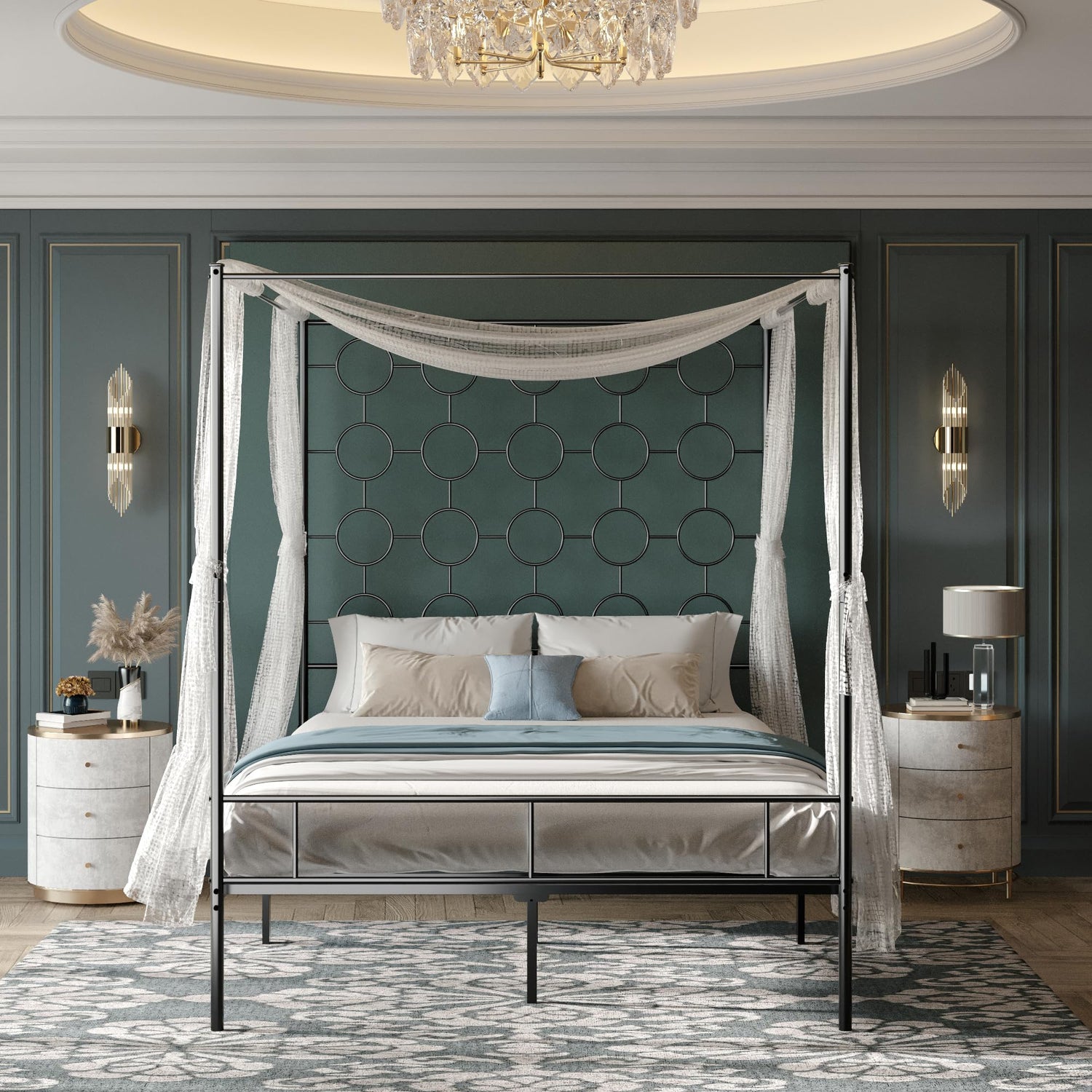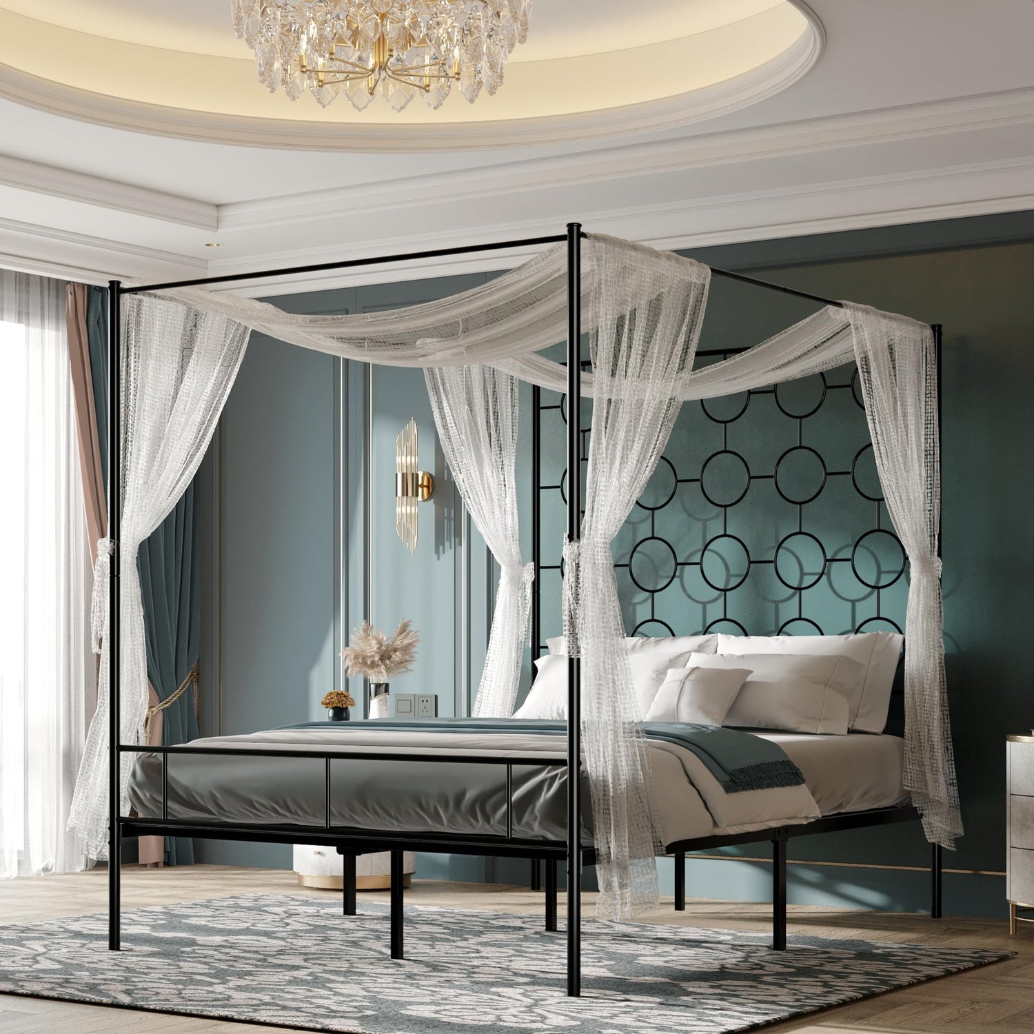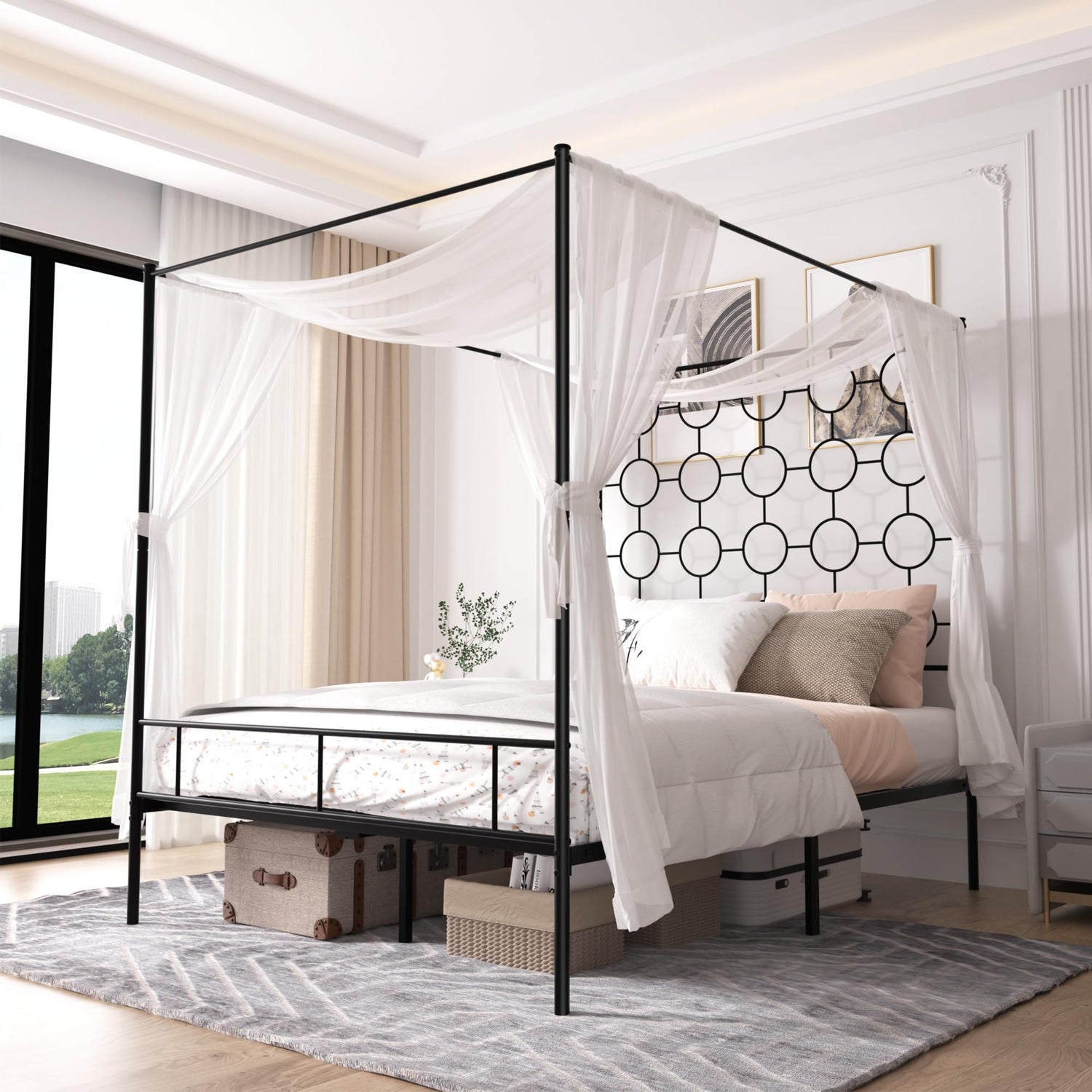 Details: Metal Canopy Platform Bed Frame Four-Poster Canopied Bed Mattress Foundation with Headboard and Footboard Sturdy Slatted Structure No Box Spring Needed Easy Assembly Queen