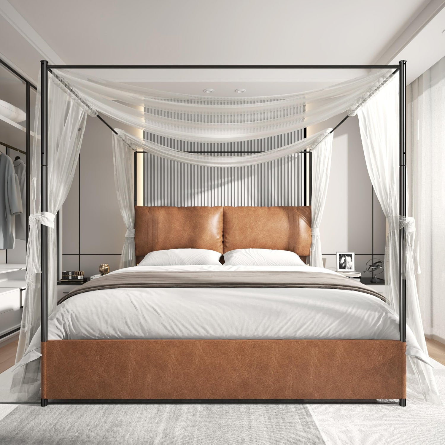 PAUKIN Canopy Bed Frame King Size with Upholstered Headboard, Sturdy and Stable, Easy to Assemble, Metal Bar Support, no Spring Mattress Required. (Brown, King)
