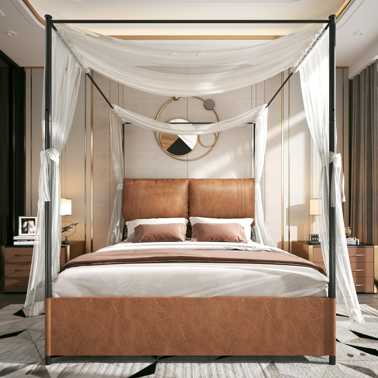 PAUKIN Canopy Bed Frame Queen Size with Upholstered Headboard, Sturdy and Stable, Easy to Assemble, Metal Bar Support, no Spring Mattress Required. (Brown, Queen)
