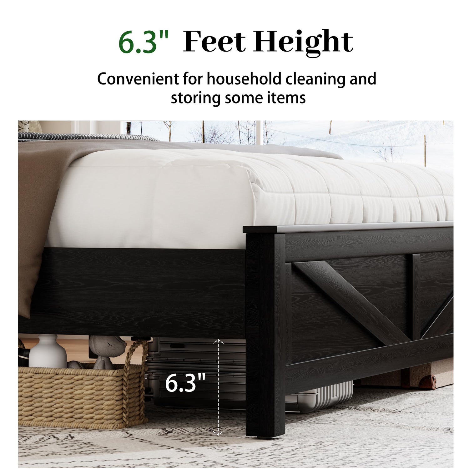 PAUKIN King Size Bed Frame with Headboard, Rustic Farmhouse Wood Bed Frame with LED Lights and Charging Station, Easy Assembly, No Box Spring Needed (Black, King)